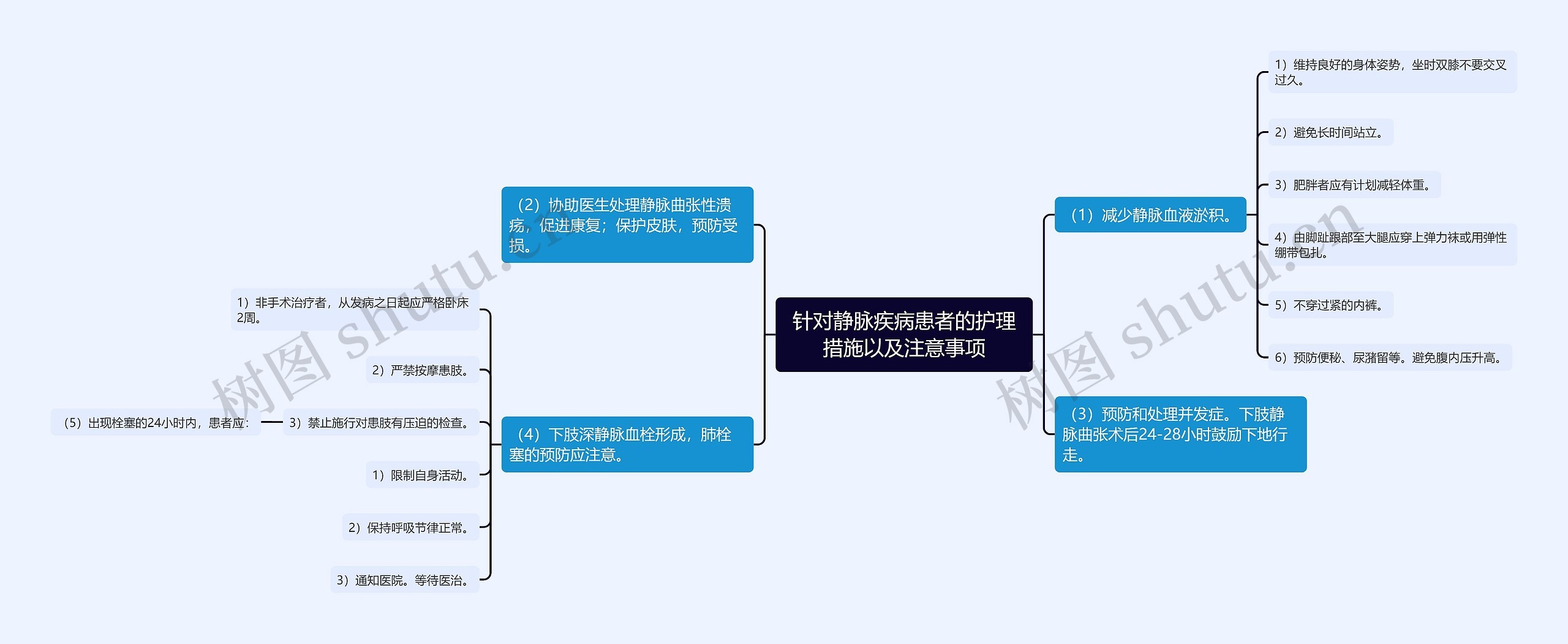 树图思维导图小编整理了针对静脉疾病患者的护理措施以及注意事项如下,请各位考生仔细查看。 (1)减少静脉血液淤积。1)维持良好的身体姿势,坐时双膝不要交叉过久。2)避免长时间站立。3)肥胖者应有计划减轻体重。4)由脚趾跟部至大腿应穿上弹力袜或用弹性绷带包扎。5)不穿过紧的内裤。6)预防便秘、尿潴留等。