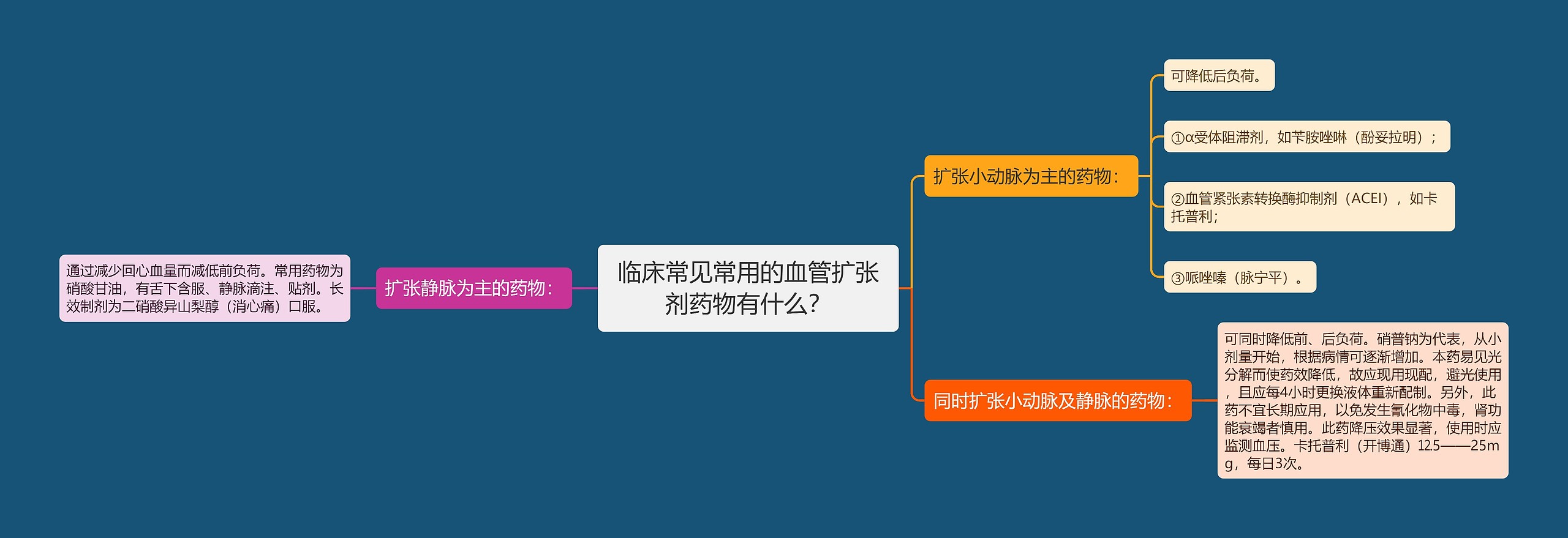 临床常见常用的血管扩张剂药物有什么?树图思维导图小编整理如下,请各位考生仔细查看。扩张小动脉为主的药物:可降低后负荷。①α受体阻滞剂,如苄胺唑啉(酚妥拉明);②血管紧张素转换酶抑制剂(ACEI),如卡托普利;③哌唑嗪(脉宁平)。扩张静脉为主的药物:通过减少回心血量而减低前负荷。