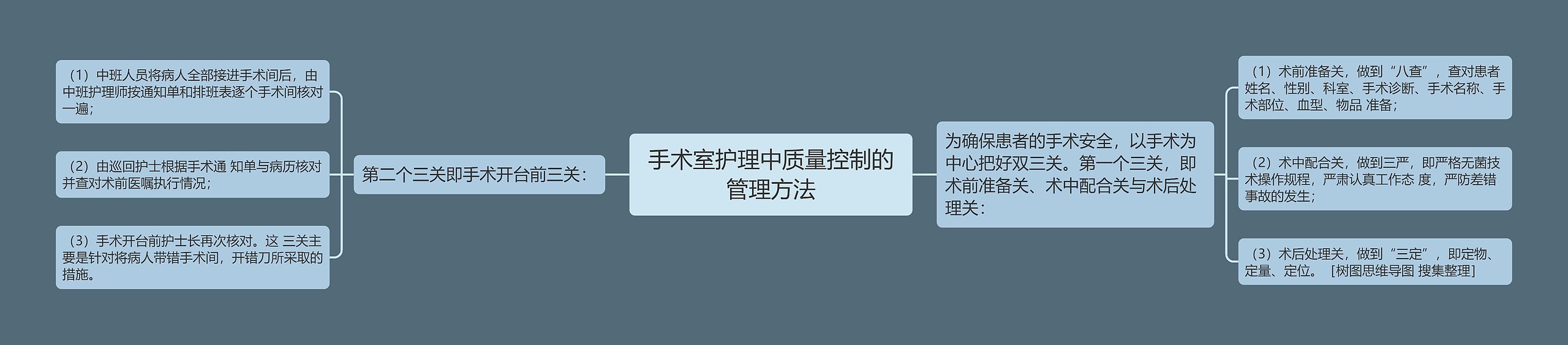 树图思维导图小编整理了手术室护理中质量控制的管理方法如下,请各位考生仔细查看。 为确保患者的手术安全,以手术为中心把好双三关。