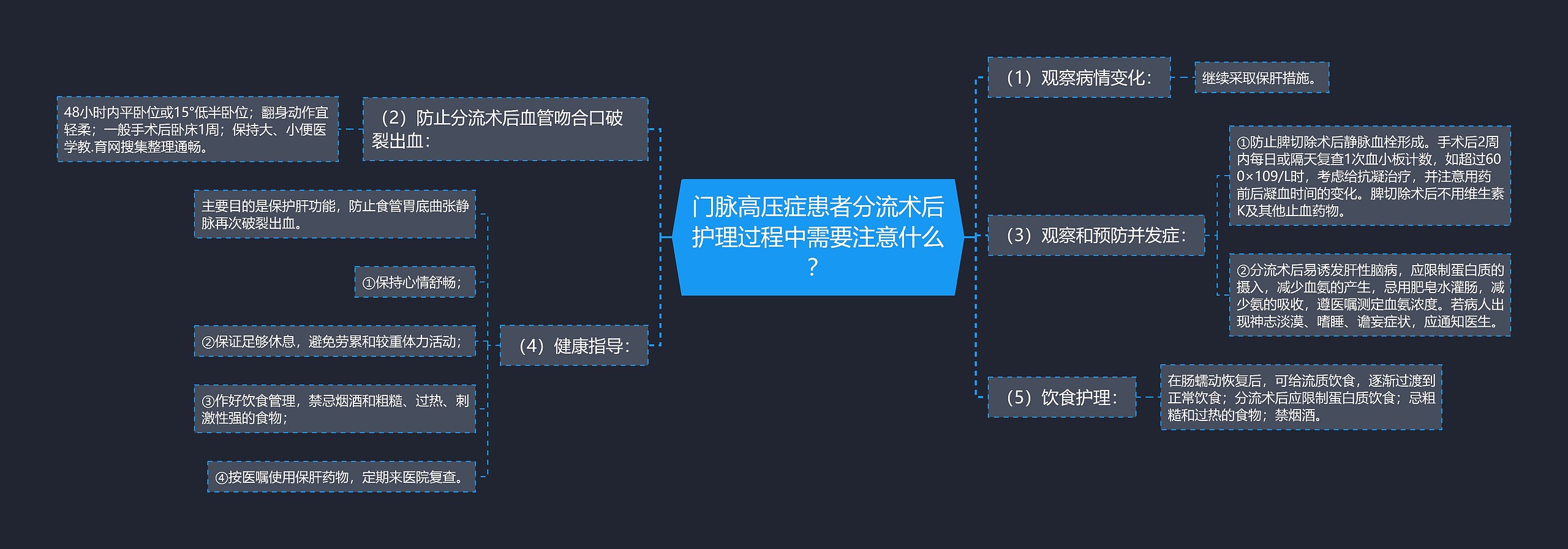 门脉高压症患者分流术后护理过程中需要注意什么?树图思维导图小编整理如下,请各位考生仔细查看。 (1)观察病情变化:继续采取保肝措施。(2)防止分流术后血管吻合口破裂出血:48小时内平卧位或15°低半卧位;翻身动作宜轻柔;一般手术后卧床1周;保持大、小便医学教.育网搜集整理通畅。