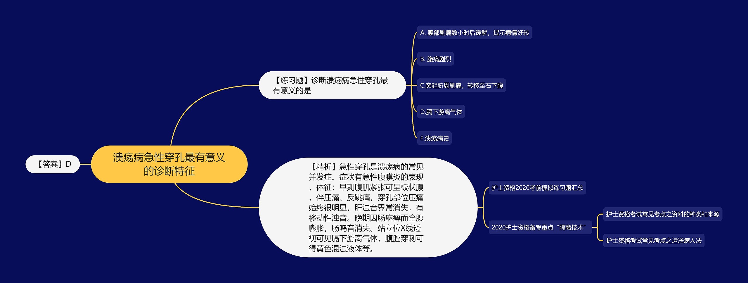 诊断溃疡病急性穿孔最有意义的特征是什么?是考生需要掌握的知识点,考前需要多看多做题,树图思维导图小编为了帮助各位考生更好地备考复习护士考试,专门整理溃疡病急性穿孔最有意义的诊断特征练习题及解析如下。
