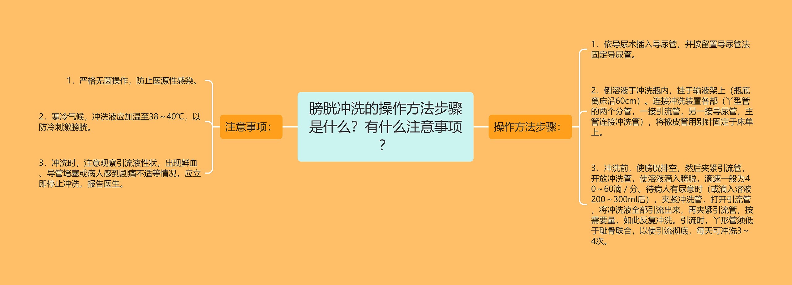 膀胱冲洗的操作方法步骤是什么?有什么注意事项?树图思维导图小编整理如下,请各位考生仔细查看。 操作方法步骤:1.依导尿术插入导尿管,并按留置导尿管法固定导尿管。2.倒溶液于冲洗瓶内,挂于输液架上(瓶底离床沿60cm)。