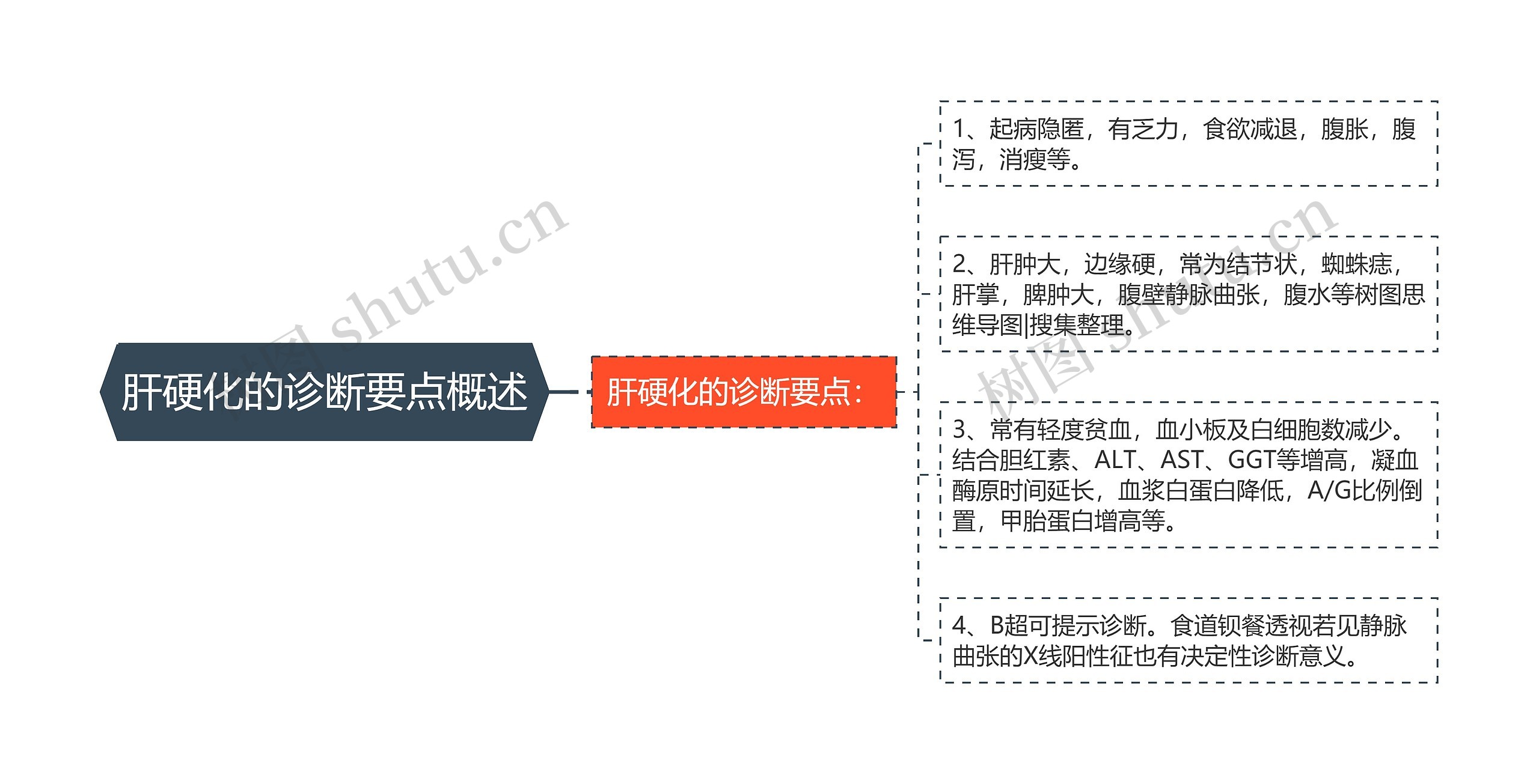 肝硬化的诊断要点: 1、起病隐匿,有乏力,食欲减退,腹胀,腹泻,消瘦等。 2、肝肿大,边缘硬,常为结节状,蜘蛛痣,肝掌,脾肿大,腹壁静脉曲张,腹水等树图思维导图|搜集整理。 3、常有轻度贫血,血小板及白细胞数减少。