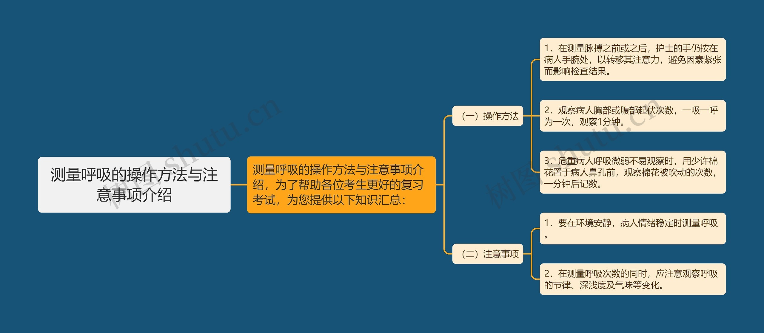 树图思维导图提供《测量呼吸的操作方法与注意事项介绍》在线思维导图免费制作,点击“编辑”按钮,可对《测量呼吸的操作方法与注意事项介绍》进行在线思维导图编辑,本思维导图属于思维导图模板主题,文件编号是:1a3f03d6726d76f90110ff14bbbf9e23