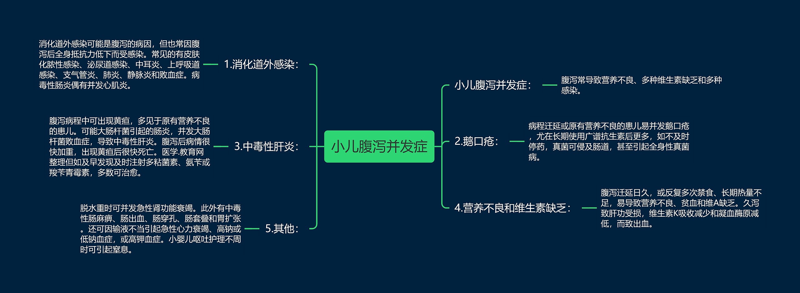 小儿腹泻并发症: 腹泻常导致营养不良、多种维生素缺乏和多种感染。 1.消化道外感染: 消化道外感染可能是腹泻的病因,但也常因腹泻后全身抵抗力低下而受感染。常见的有皮肤化脓性感染、泌尿道感染、中耳炎、上呼吸道感染、支气管炎、肺炎、静脉炎和败血症。病毒性肠炎偶有并发心肌炎。