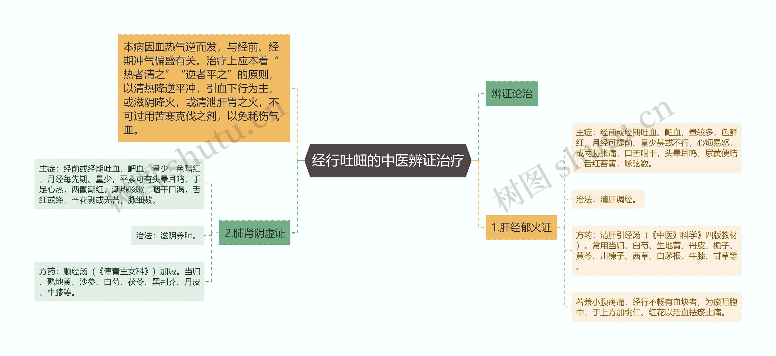 关于“经行吐衄的中医辨证治疗”的相关知识,树图思维导图搜集整理了如下内容,希望可以帮助到您。 辨证论治本病因血热气逆而发,与经前、经期冲气偏盛有关。治疗上应本着“热者清之”“逆者平之”的原则,以清热降逆平冲,引血下行为主,或滋阴降火,或清泄肝胃之火,不可过用苦寒克伐之剂,以免耗伤气血。