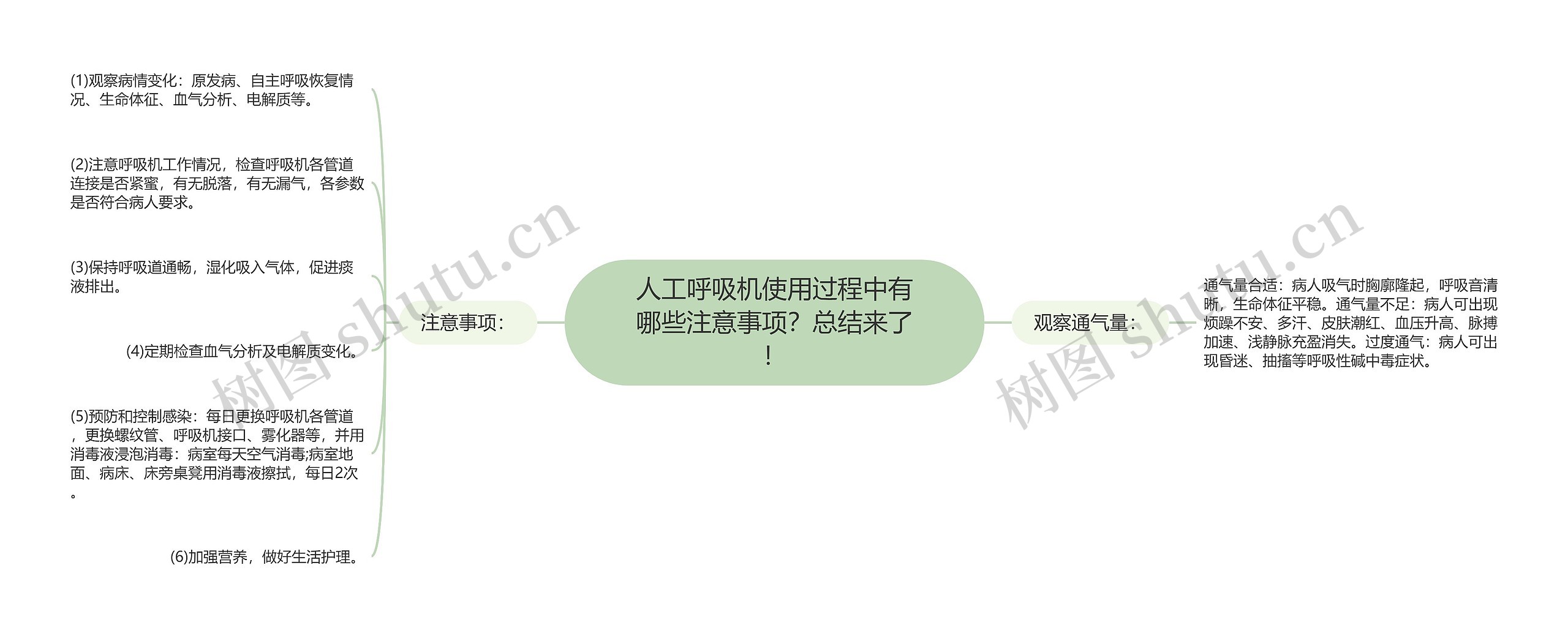 人工呼吸机使用过程中有哪些注意事项?总结来了!树图思维导图小编整理如下,请各位考生仔细查看。 观察通气量:通气量合适:病人吸气时胸廓隆起,呼吸音清晰,生命体征平稳。通气量不足:病人可出现烦躁不安、多汗、皮肤潮红、血压升高、脉搏加速、浅静脉充盈消失。过度通气:病人可出现昏迷、抽搐等呼吸性碱中毒症状。