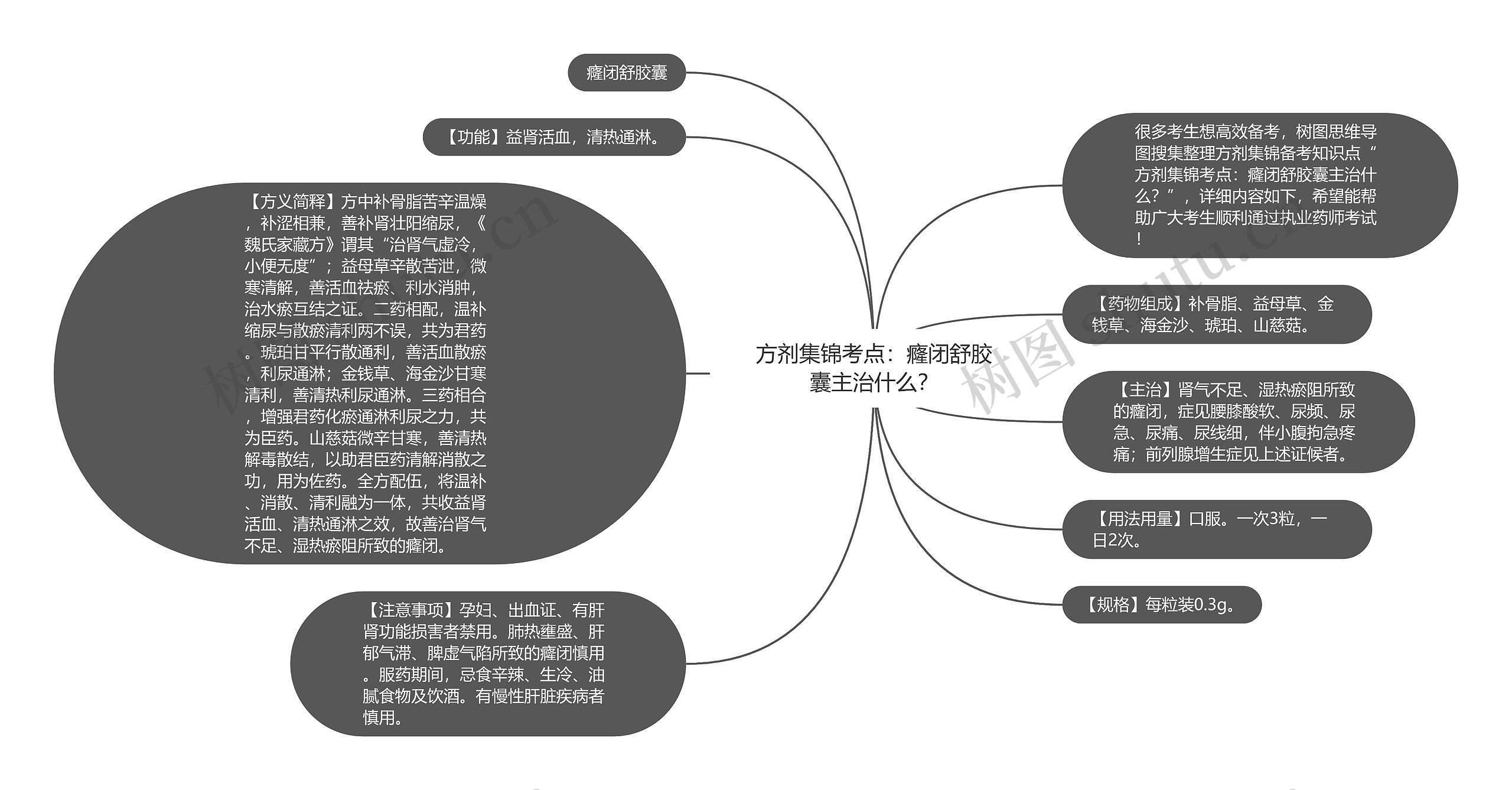 很多考生想高效备考,树图思维导图搜集整理方剂集锦备考知识点“方剂集锦考点:癃闭舒胶囊主治什么?”,详细内容如下,希望能帮助广大考生顺利通过执业药师考试!癃闭舒胶囊【药物组成】补骨脂、益母草、金钱草、海金沙、琥珀、山慈菇。【功能】益肾活血,清热通淋。