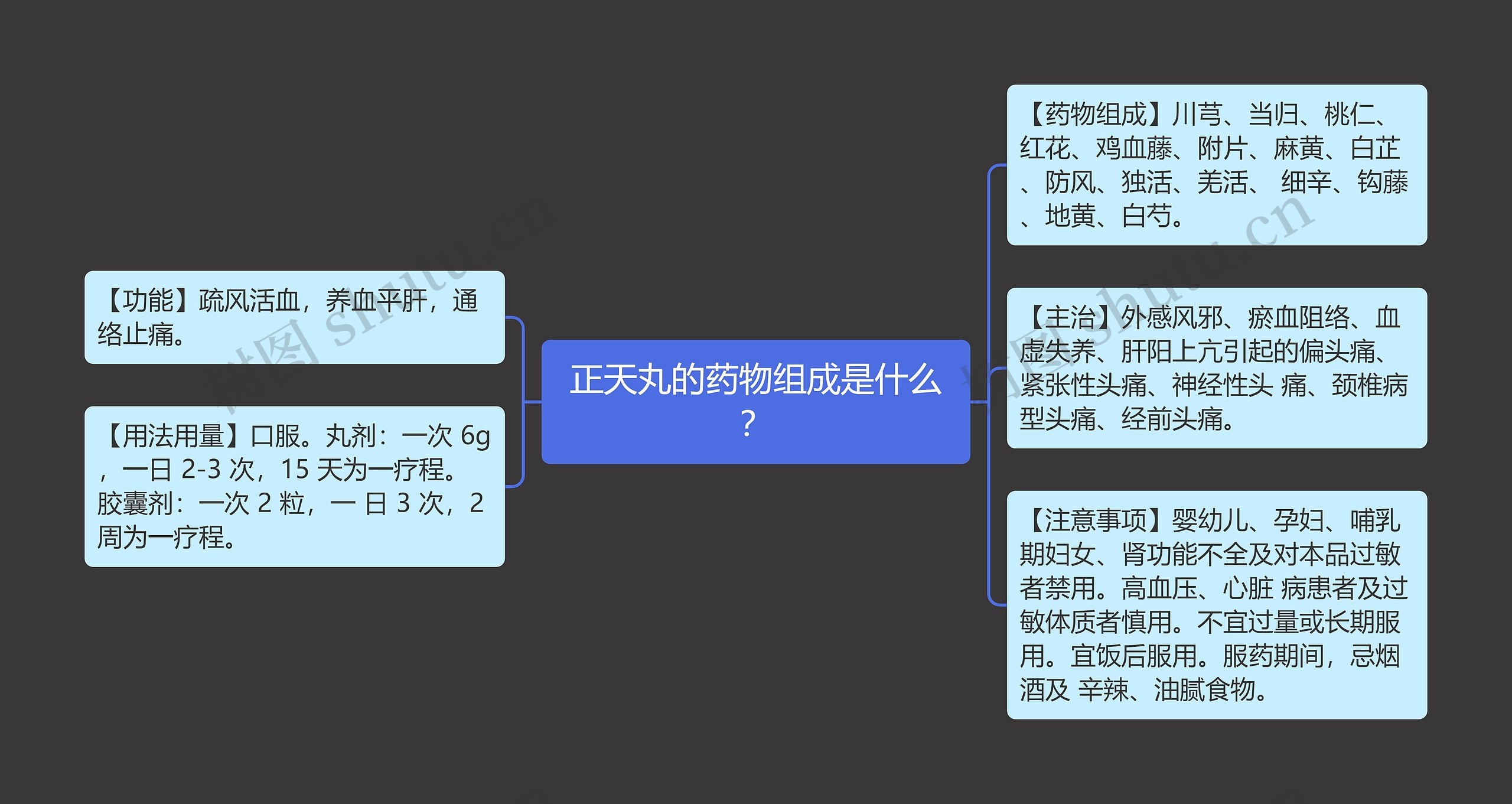 树图思维导图提供《正天丸的药物组成是什么?》在线思维导图免费制作,点击“编辑”按钮,可对《正天丸的药物组成是什么?》进行在线思维导图编辑,本思维导图属于思维导图模板主题,文件编号是:c54e30fc80474b5720ff33afe0b47e3c