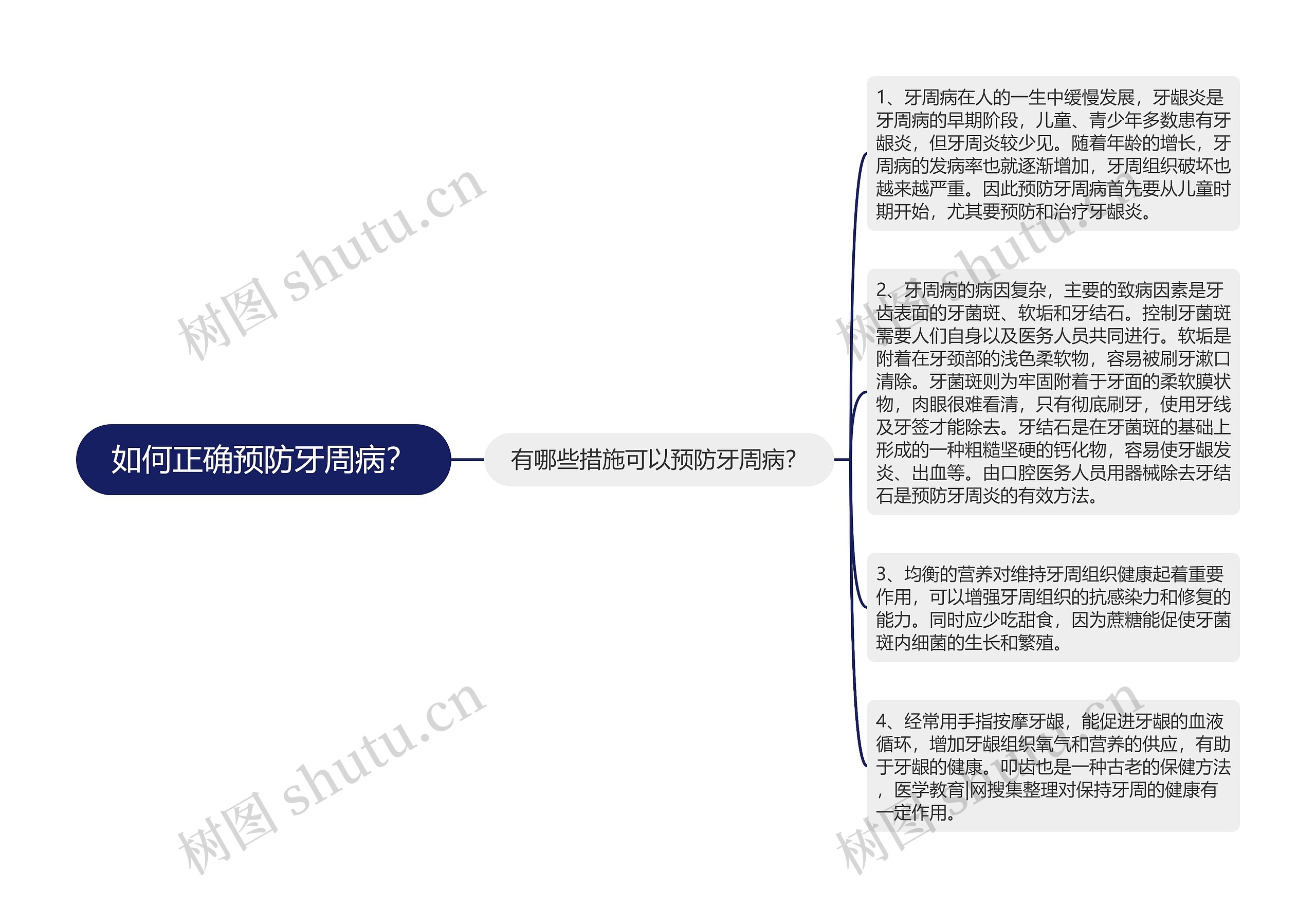 预防牙周病的措施,相信这是正在备考的小伙伴们最想知道,最想了解的问题。下面树图思维导图小编为大家搜集整理了相关信息,希望对大家能有所帮助。 有哪些措施可以预防牙周病? 1、牙周病在人的一生中缓慢发展,牙龈炎是牙周病的早期阶段,儿童、青少年多数患有牙龈炎,但牙周炎较少见。