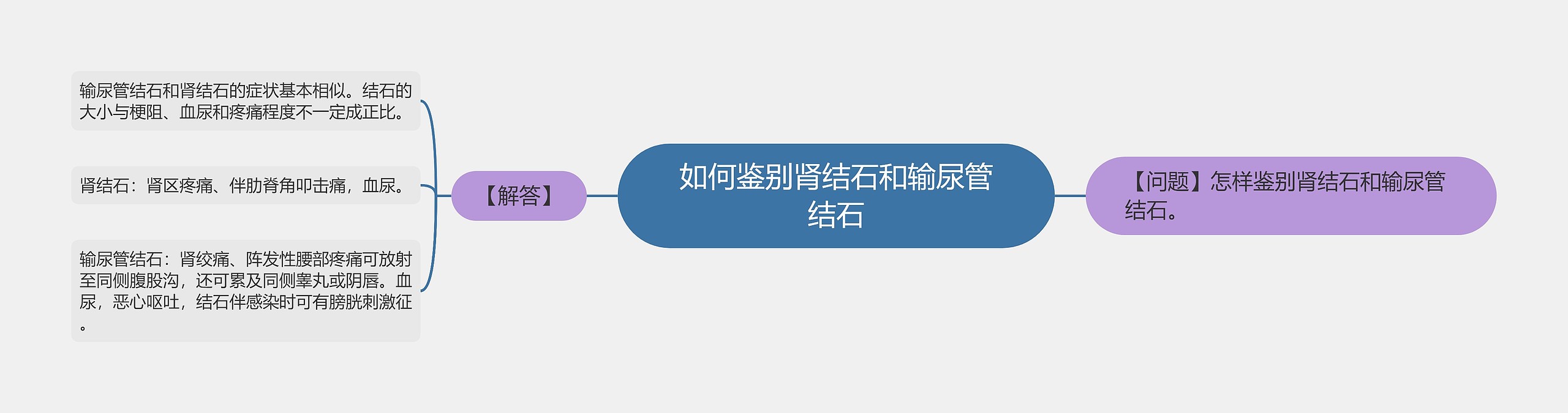 如何鉴别肾结石和输尿管结石?树图思维导图小编专门整理如下,请各位主管护师考生仔细查看。【问题】怎样鉴别肾结石和输尿管结石。【解答】输尿管结石和肾结石的症状基本相似。结石的大小与梗阻、血尿和疼痛程度不一定成正比。肾结石:肾区疼痛、伴肋脊角叩击痛,血尿。