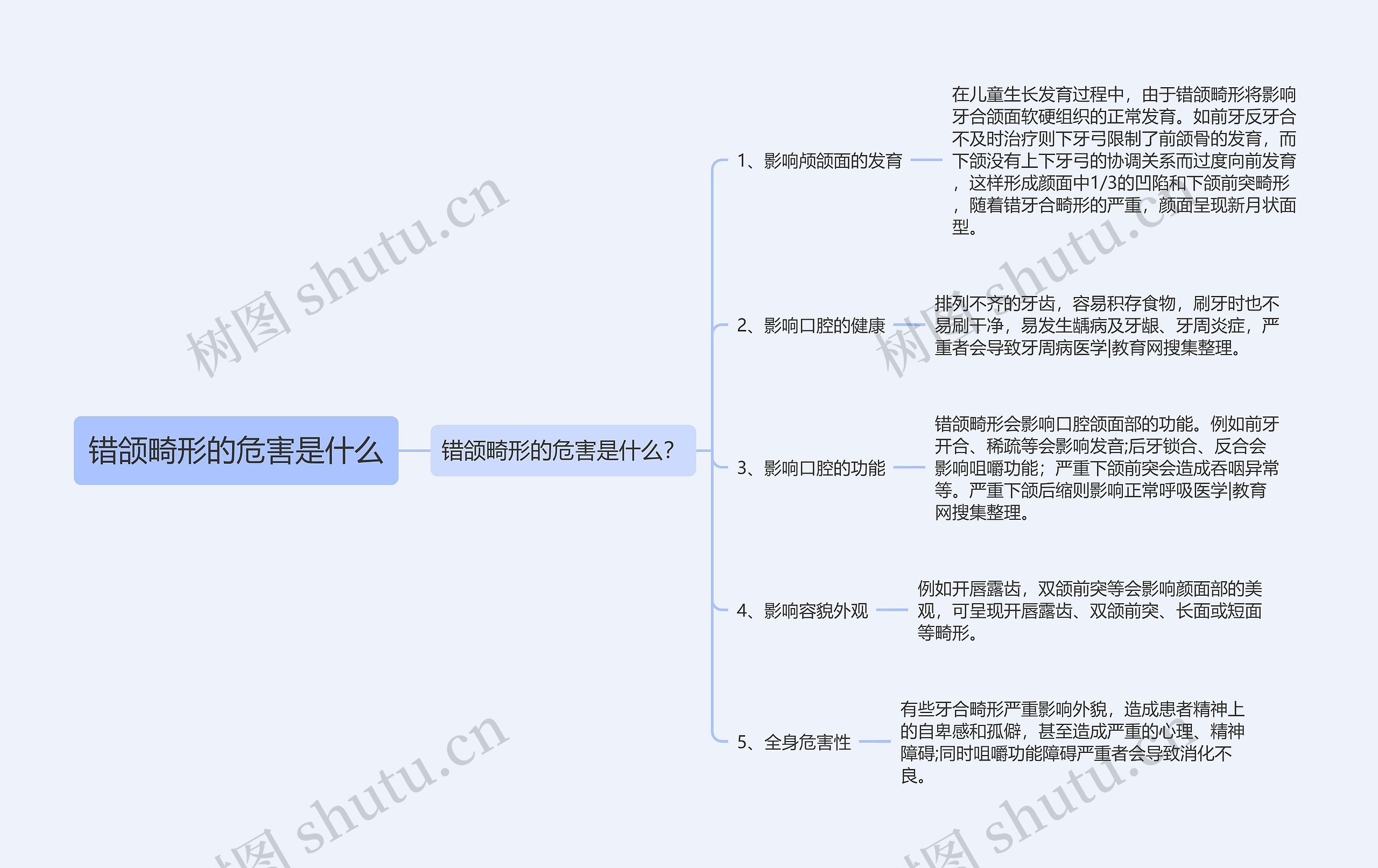 错颌畸形的危害是什么?错颌畸形的危害有哪些?相信这是大家最想知道,最想了解的问题。下面树图思维导图小编为大家搜集整理了相关信息,希望对大家了解错颌畸形的危害是什么能有所帮助。 错颌畸形的危害是什么? 1、影响颅颌面的发育 在儿童生长发育过程中,由于错颌畸形将影响牙合颌面软硬组织的正常发育。