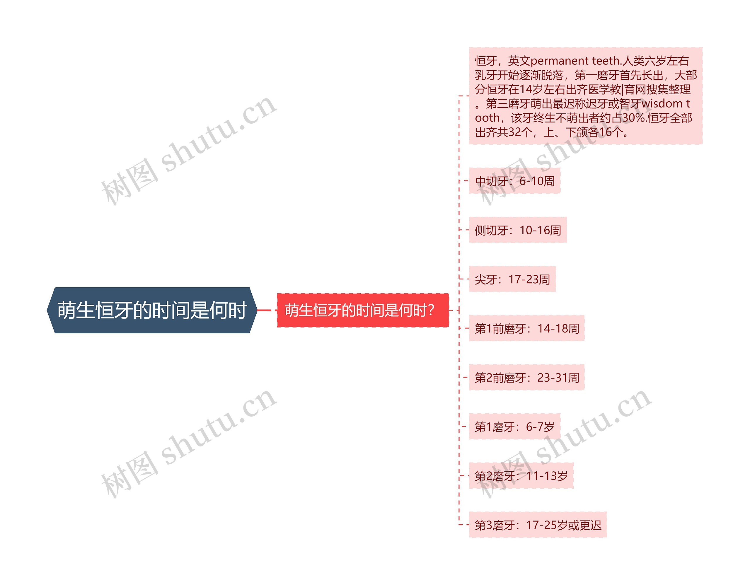 萌生恒牙的时间是何时?相信这是大家最想知道,最想了解的问题。下面树图思维导图小编为大家搜集整理了相关信息,希望对大家了解萌生恒牙的时间是何时能有所帮助。 萌生恒牙的时间是何时? 恒牙,英文permanent teeth.人类六岁左右乳牙开始逐渐脱落,第一磨牙首先长出,大部分恒牙在14岁左右出齐医学教|育网搜集整理。