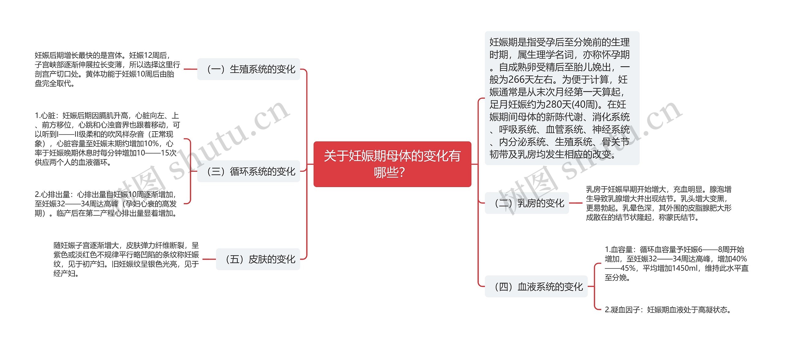 关于妊娠期母体的变化有哪些?相信各位考生对此问题比较感兴趣,树图思维导图小编为您汇总如下:妊娠期是指受孕后至分娩前的生理时期,属生理学名词,亦称怀孕期。自成熟卵受精后至胎儿娩出,一般为266天左右。为便于计算,妊娠通常是从末次月经第一天算起,足月妊娠约为280天(40周)。