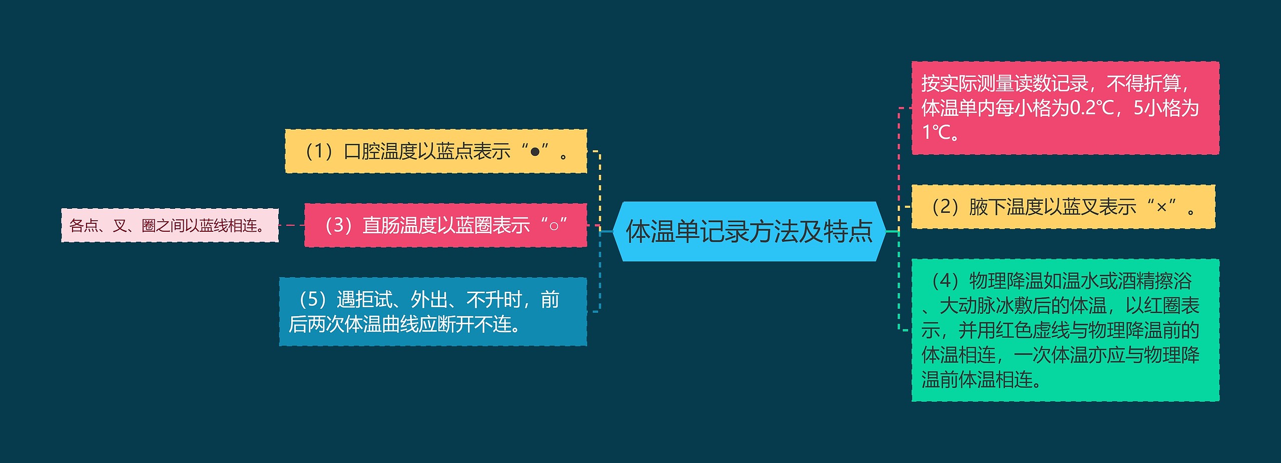 树图思维导图小编整理了体温单记录方法及特点如下,请各位考生仔细查看。 按实际测量读数记录,不得折算,体温单内每小格为0.2℃,5小格为1℃。(1)口腔温度以蓝点表示“●”。(2)腋下温度以蓝叉表示“×”。(3)直肠温度以蓝圈表示“○”各点、叉、圈之间以蓝线相连。