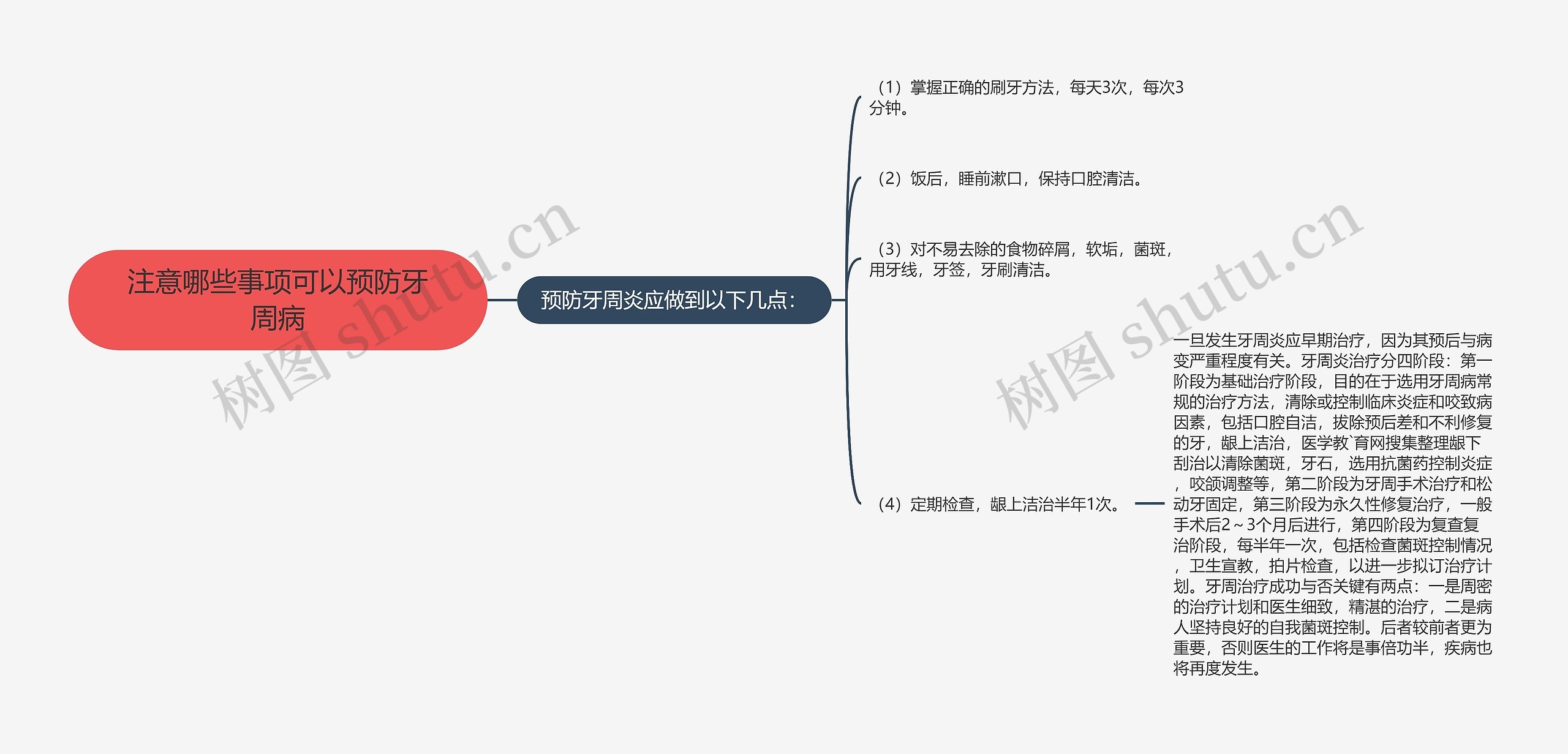 注意哪些事项可以预防牙周病?牙周病的预防方法有哪些?相信这都是大家最想知道,最想了解的问题。下面树图思维导图小编为大家搜集整理了相关信息,希望对大家了解牙周病的预防方法能有所帮助。 预防牙周炎应做到以下几点: (1)掌握正确的刷牙方法,每天3次,每次3分钟。 (2)饭后,睡前漱口,保持口腔清洁。