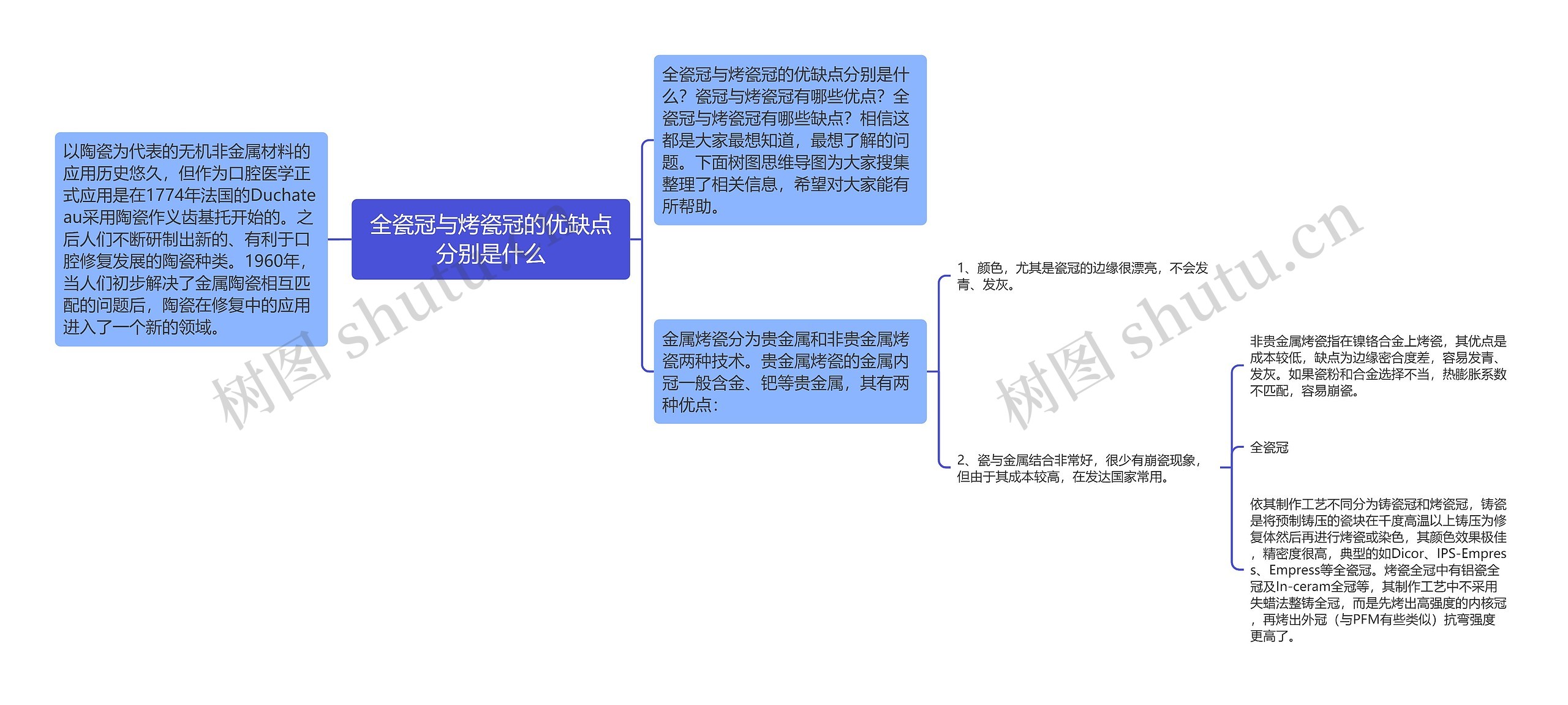全瓷冠与烤瓷冠的优缺点分别是什么?瓷冠与烤瓷冠有哪些优点?全瓷冠与烤瓷冠有哪些缺点?相信这都是大家最想知道,最想了解的问题。下面树图思维导图为大家搜集整理了相关信息,希望对大家能有所帮助。