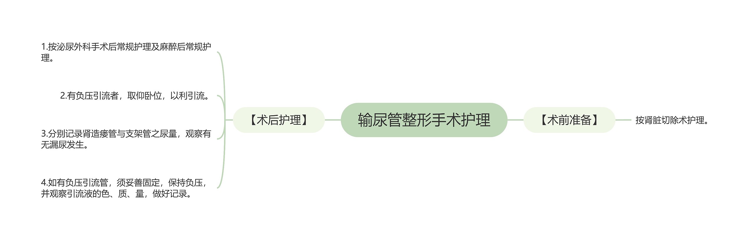 树图思维导图小编整理了输尿管整形手术护理如下,请各位考生仔细查看。 【术前准备】按肾脏切除术护理。【术后护理】1.按泌尿外科手术后常规护理及麻醉后常规护理。2.有负压引流者,取仰卧位,以利引流。3.分别记录肾造瘘管与支架管之尿量,观察有无漏尿发生。