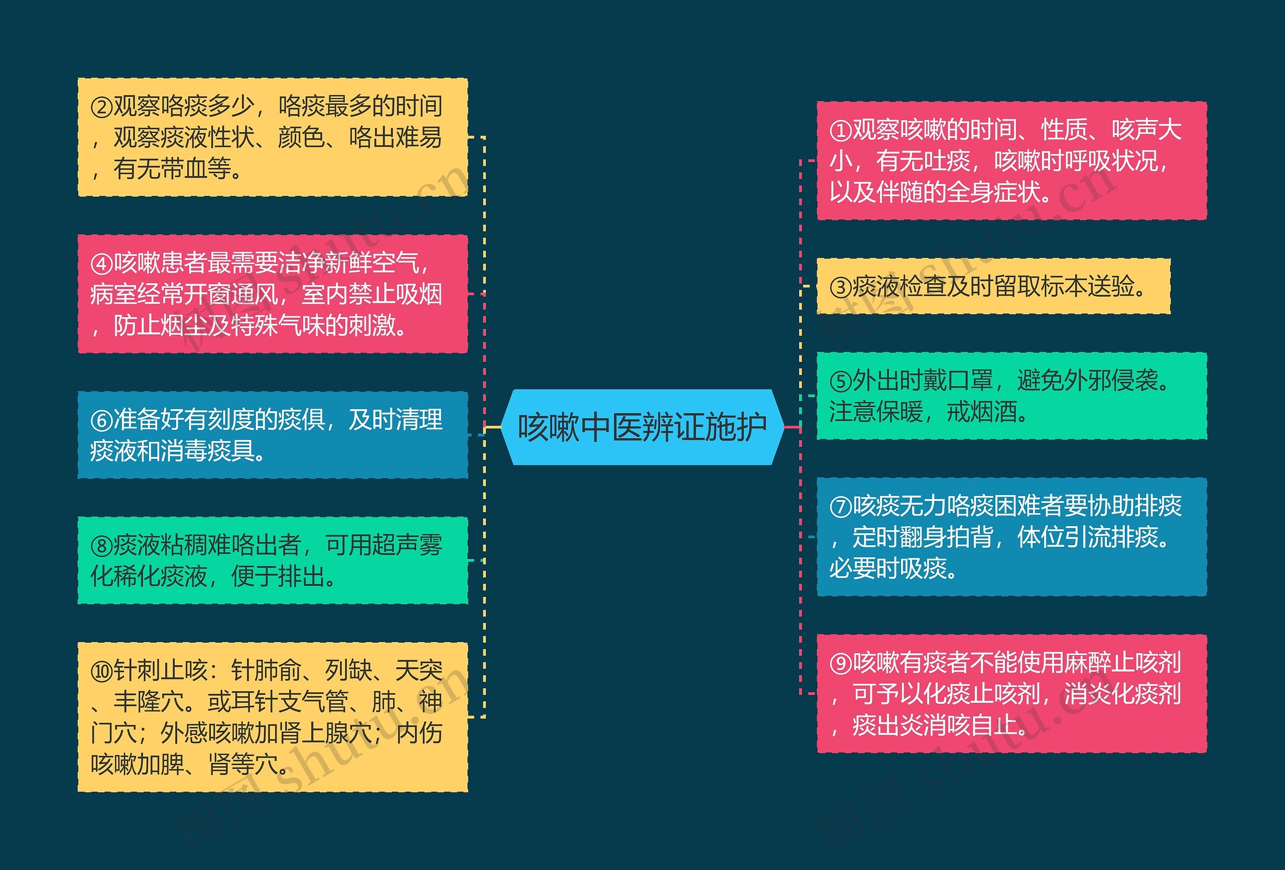树图思维导图小编整理了咳嗽中医辨证施护如下,请各位考生仔细查看。 ①观察咳嗽的时间、性质、咳声大小,有无吐痰,咳嗽时呼吸状况,以及伴随的全身症状。②观察咯痰多少,咯痰最多的时间,观察痰液性状、颜色、咯出难易,有无带血等。③痰液检查及时留取标本送验。