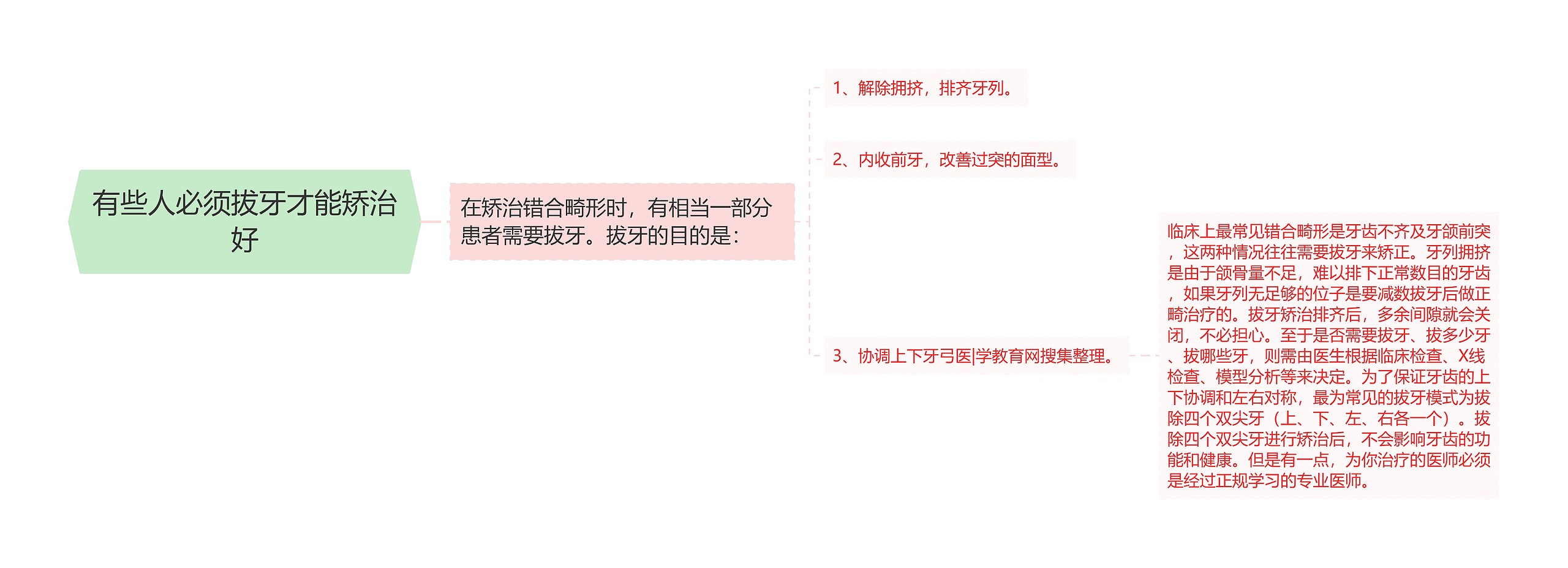 有些人必须拔牙才能矫治好,这是为什么呢?树图思维导图小编就和大家聊一聊原由。 在矫治错合畸形时,有相当一部分患者需要拔牙。拔牙的目的是: 1、解除拥挤,排齐牙列。 2、内收前牙,改善过突的面型。 3、协调上下牙弓医|学教育网搜集整理。 临床上最常见错合畸形是牙齿不齐及牙颌前突,这两种情况往往需要拔牙来矫正。
