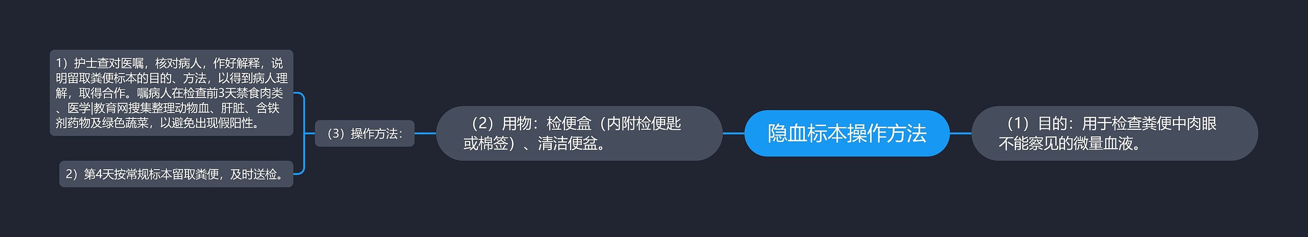 树图思维导图小编整理了隐血标本操作方法如下,请各位考生仔细查看。 (1)目的:用于检查粪便中肉眼不能察见的微量血液。(2)用物:检便盒(内附检便匙或棉签)、清洁便盆。(3)操作方法:1)护士查对医嘱,核对病人,作好解释,说明留取粪便标本的目的、方法,以得到病人理解,取得合作。