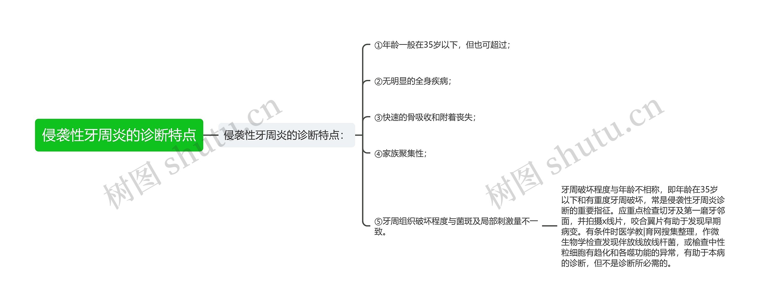 树图思维导图提供《侵袭性牙周炎的诊断特点》在线思维导图免费制作,点击“编辑”按钮,可对《侵袭性牙周炎的诊断特点》进行在线思维导图编辑,本思维导图属于思维导图模板主题,文件编号是:ccbe9808adb5c4cf830280cdd6511062