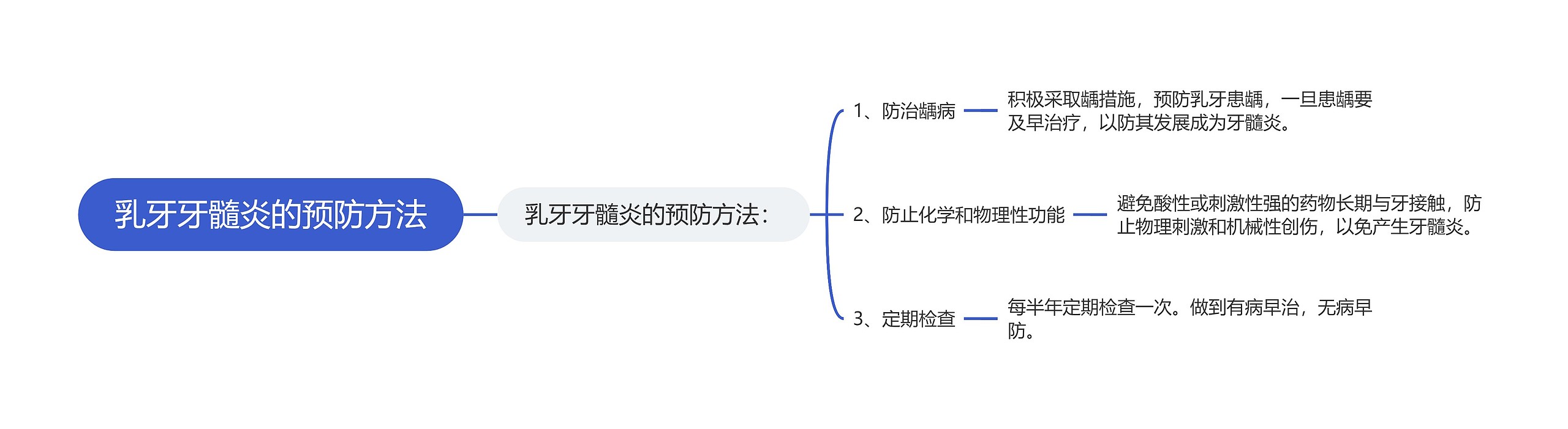 乳牙牙髓炎的预防方法: 1、防治龋病 积极采取龋措施,预防乳牙患龋,一旦患龋要及早治疗,以防其发展成为牙髓炎。 2、防止化学和物理性功能 避免酸性或刺激性强的药物长期与牙接触,防止物理刺激和机械性创伤,以免产生牙髓炎。 3、定期检查 每半年定期检查一次。做到有病早治,无病早防。