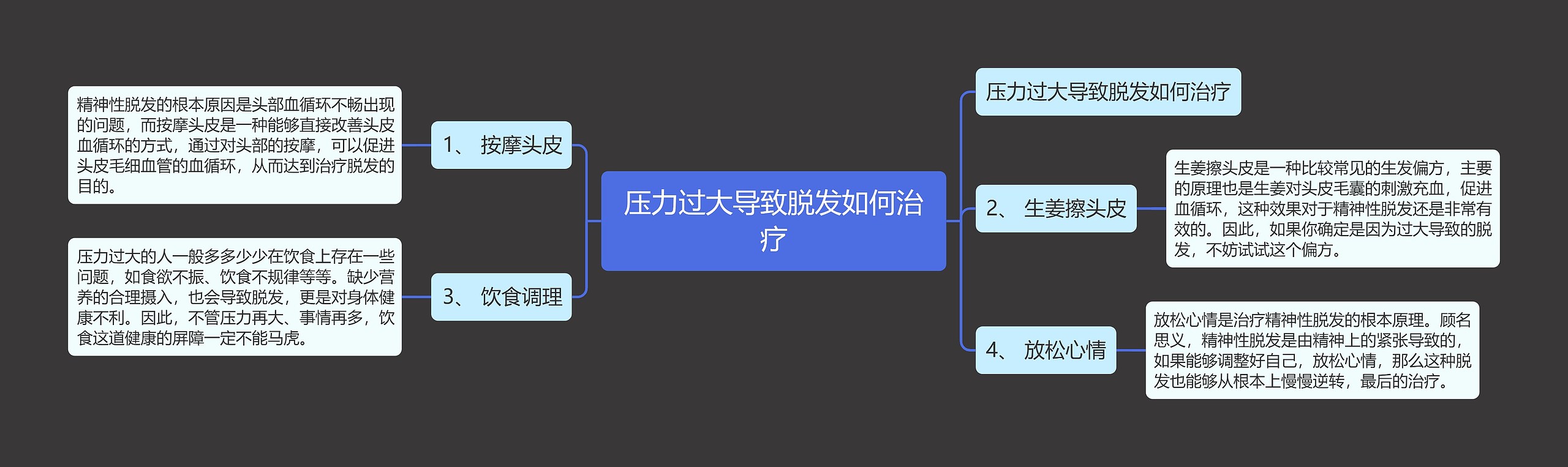 树图思维导图提供《压力过大导致脱发如何治疗》在线思维导图免费制作,点击“编辑”按钮,可对《压力过大导致脱发如何治疗》进行在线思维导图编辑,本思维导图属于思维导图模板主题,文件编号是:89600fe8034546d244f1fadee278a69e