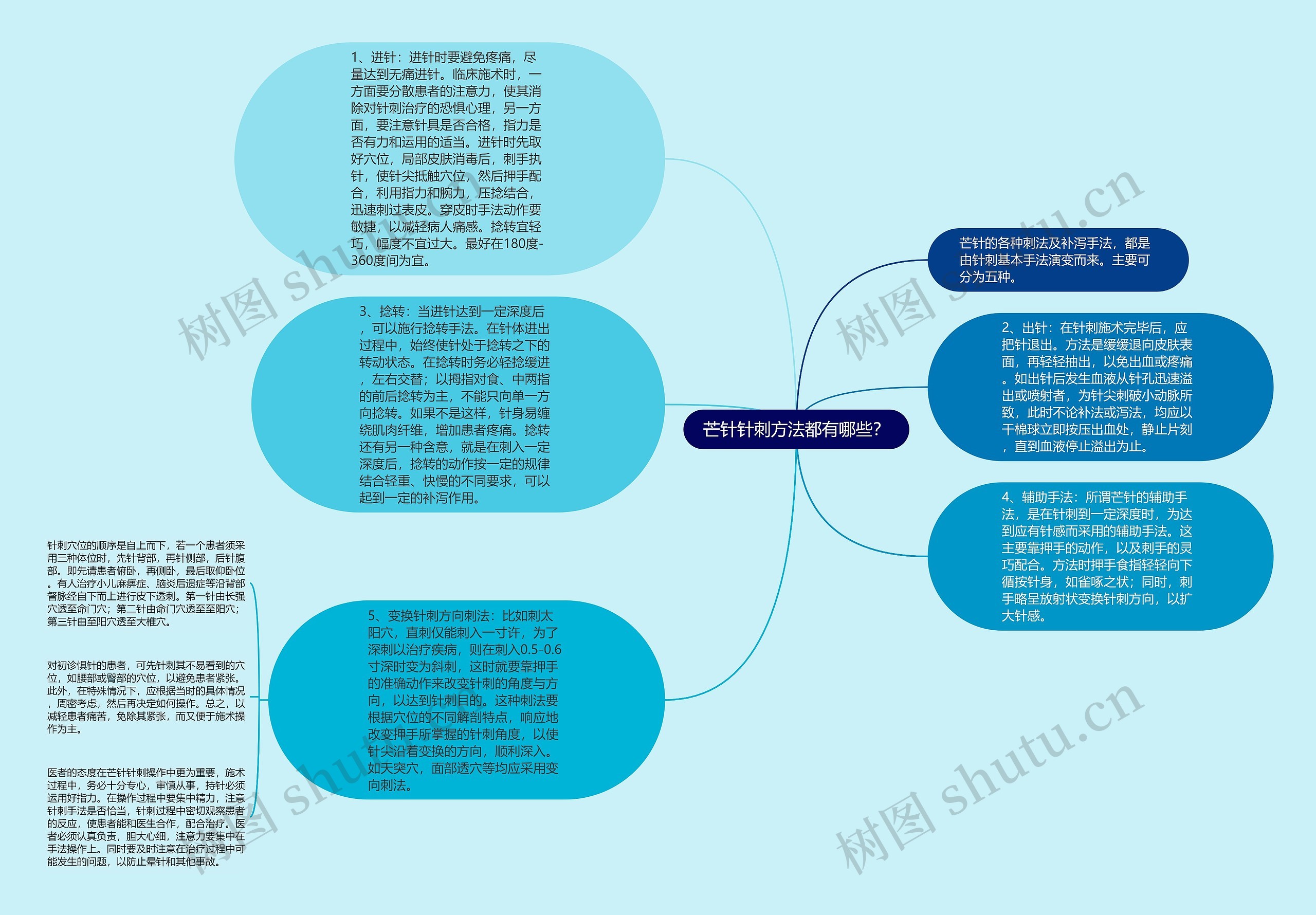 芒针的各种刺法及补泻手法,都是由针刺基本手法演变而来。主要可分为五种。
