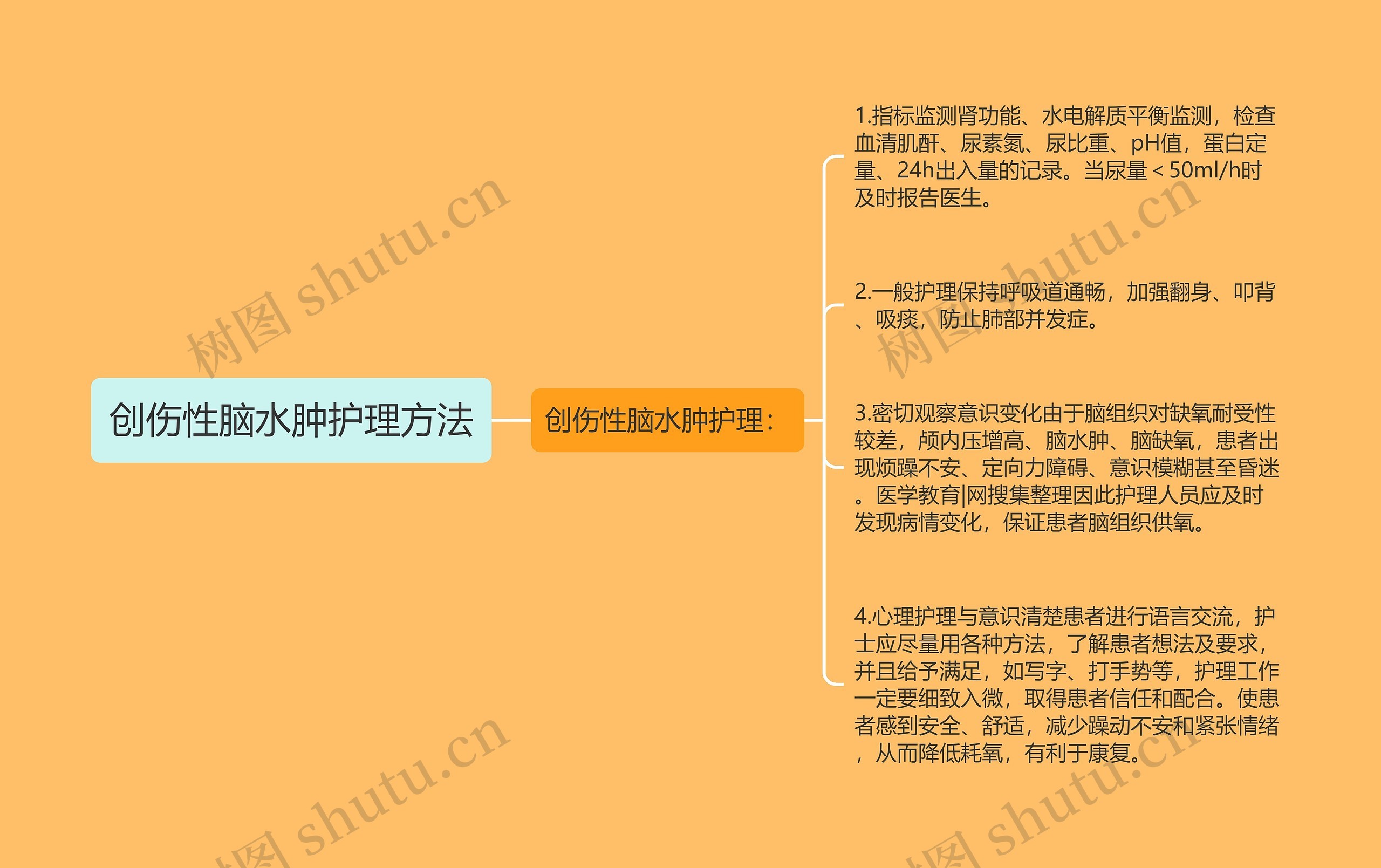创伤性脑水肿护理: 1.指标监测肾功能、水电解质平衡监测,检查血清肌酐、尿素氮、尿比重、pH值,蛋白定量、24h出入量的记录。当尿量<50ml/h时及时报告医生。 2.一般护理保持呼吸道通畅,加强翻身、叩背、吸痰,防止肺部并发症。