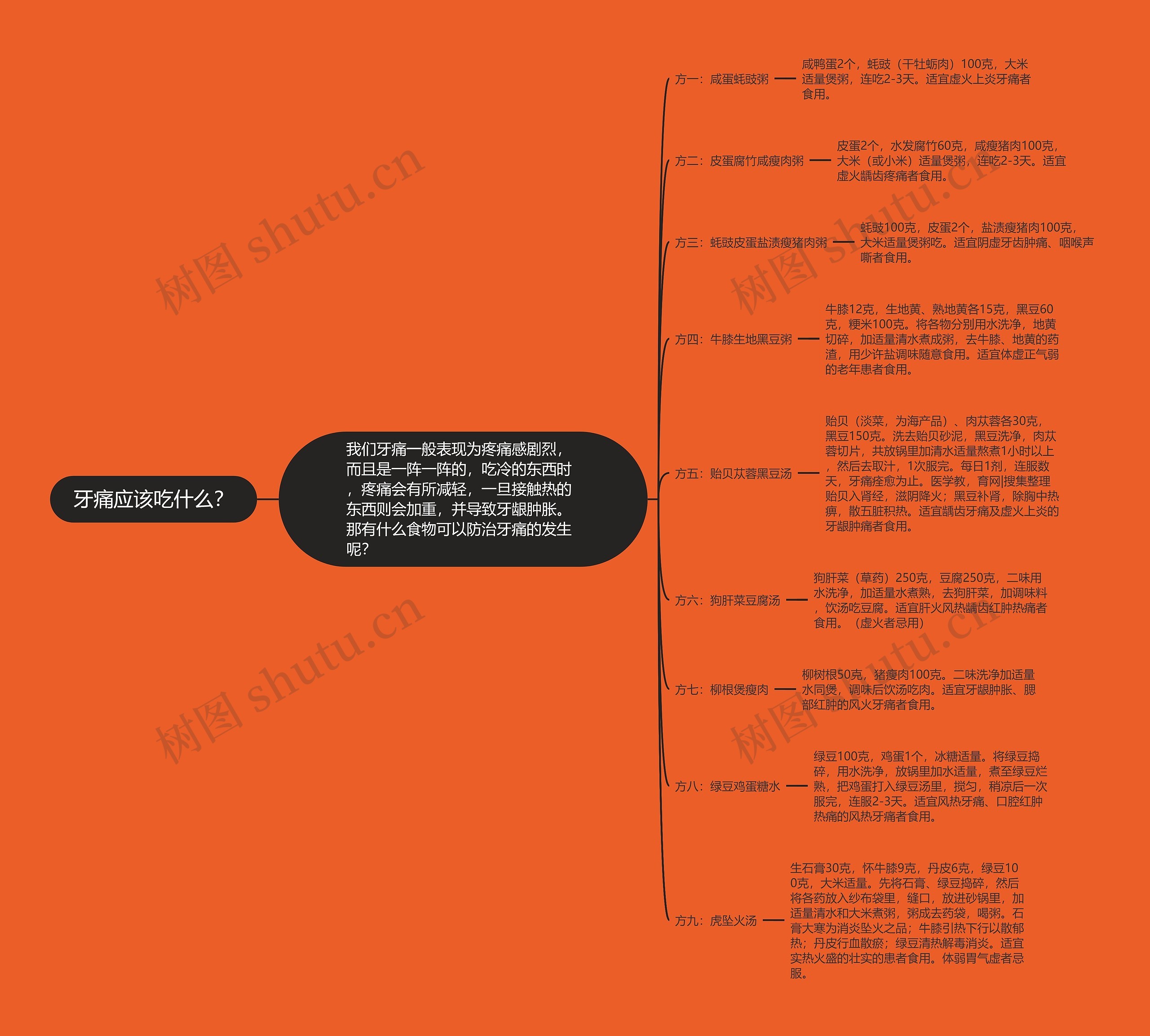 树图思维导图提供《牙痛应该吃什么?》在线思维导图免费制作,点击“编辑”按钮,可对《牙痛应该吃什么?》进行在线思维导图编辑,本思维导图属于思维导图模板主题,文件编号是:9fbe8624ea84f8ad94fdb791837a5488