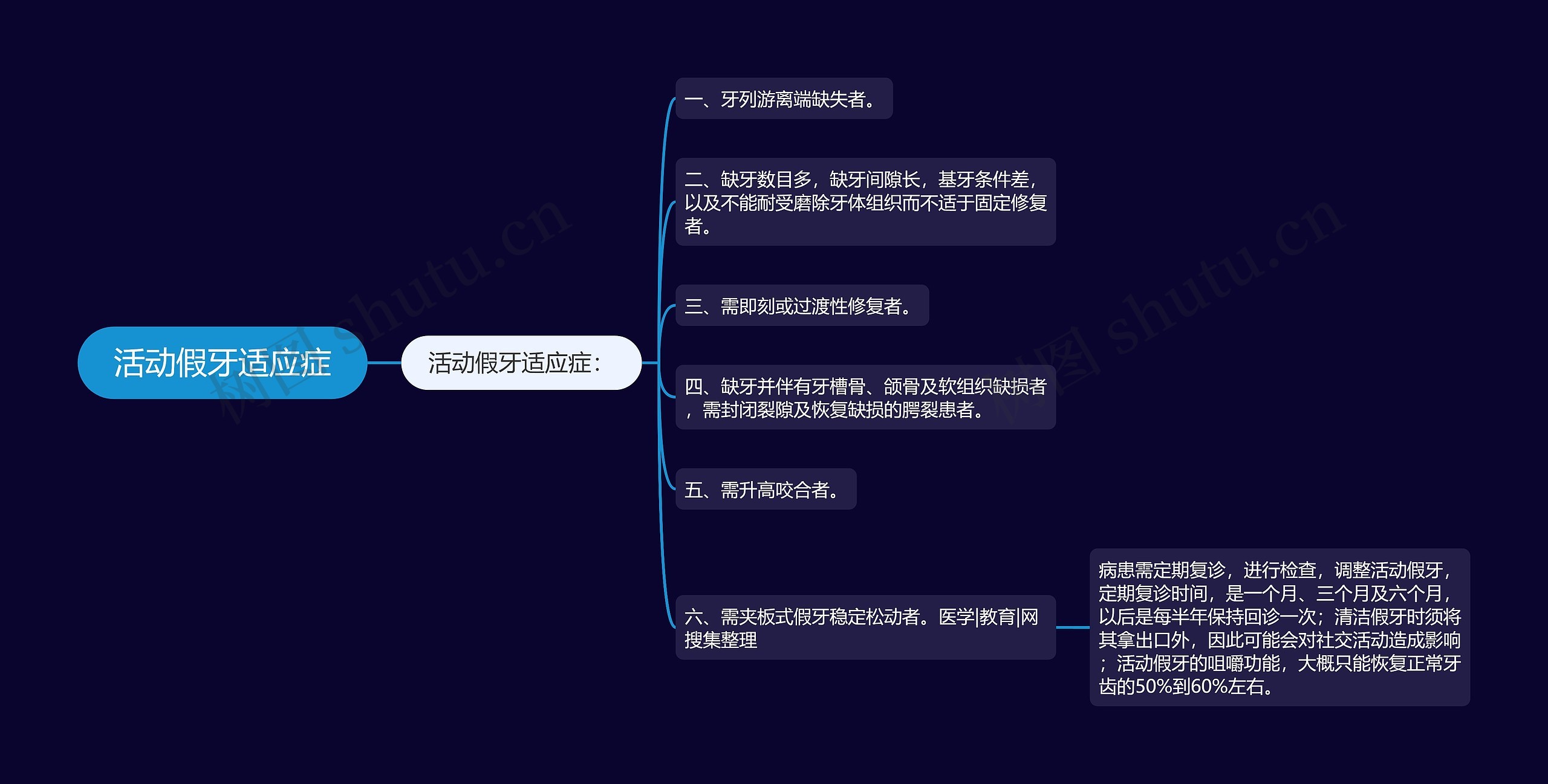 树图思维导图提供《活动假牙适应症》在线思维导图免费制作,点击“编辑”按钮,可对《活动假牙适应症》进行在线思维导图编辑,本思维导图属于思维导图模板主题,文件编号是:5238a3e8b2f4391db2d282d424721050