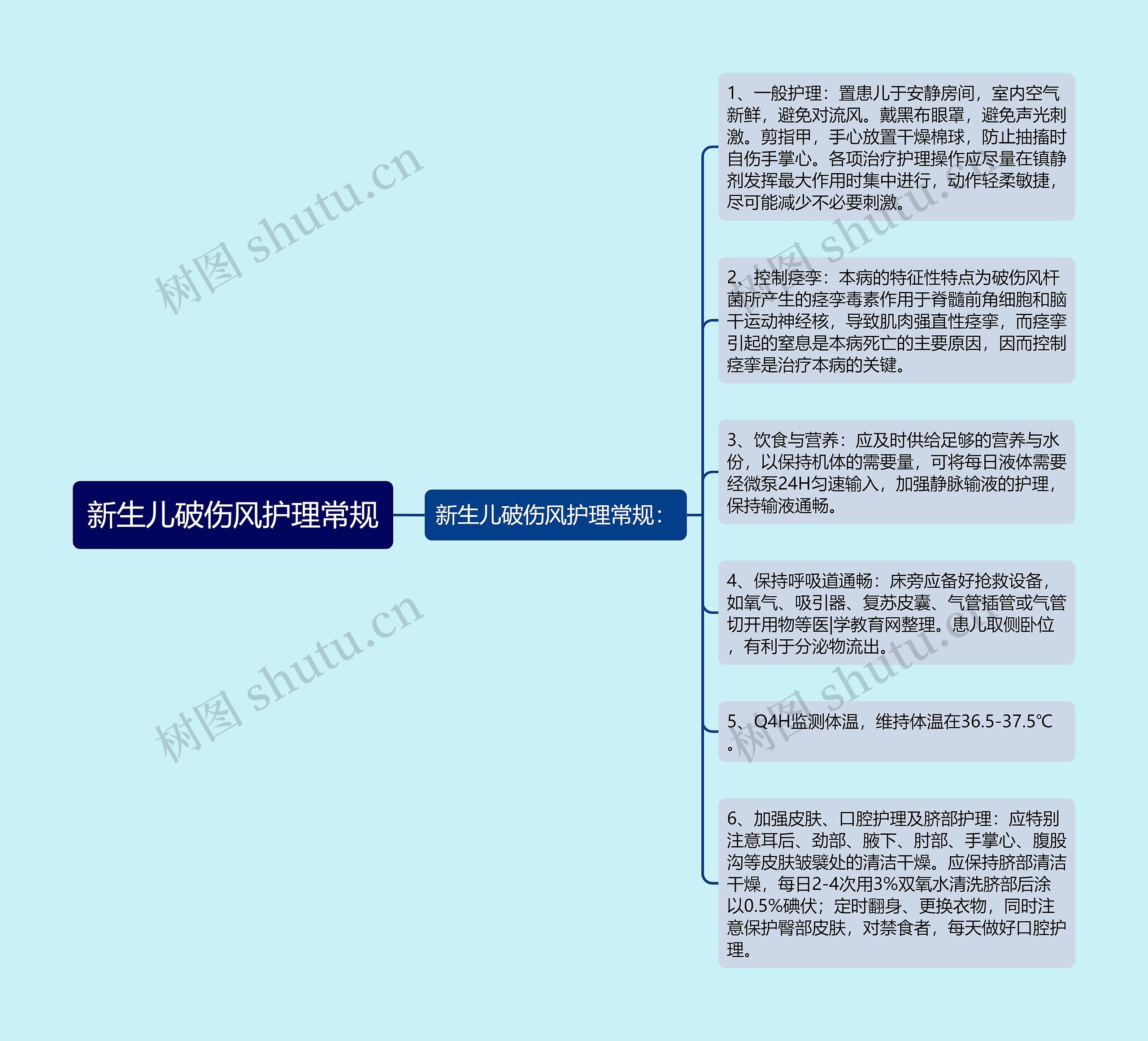 6、加强皮肤、口腔护理及脐部护理:应特别注意耳后、劲部、腋下、肘部、手掌心、腹股沟等皮肤皱襞处的清洁干燥。应保持脐部清洁干燥,每日2-4次用3%双氧水清洗脐部后涂以0.5%碘伏;定时翻身、更换衣物,同时注意保护臀部皮肤,对禁食者,每天做好口腔护理。