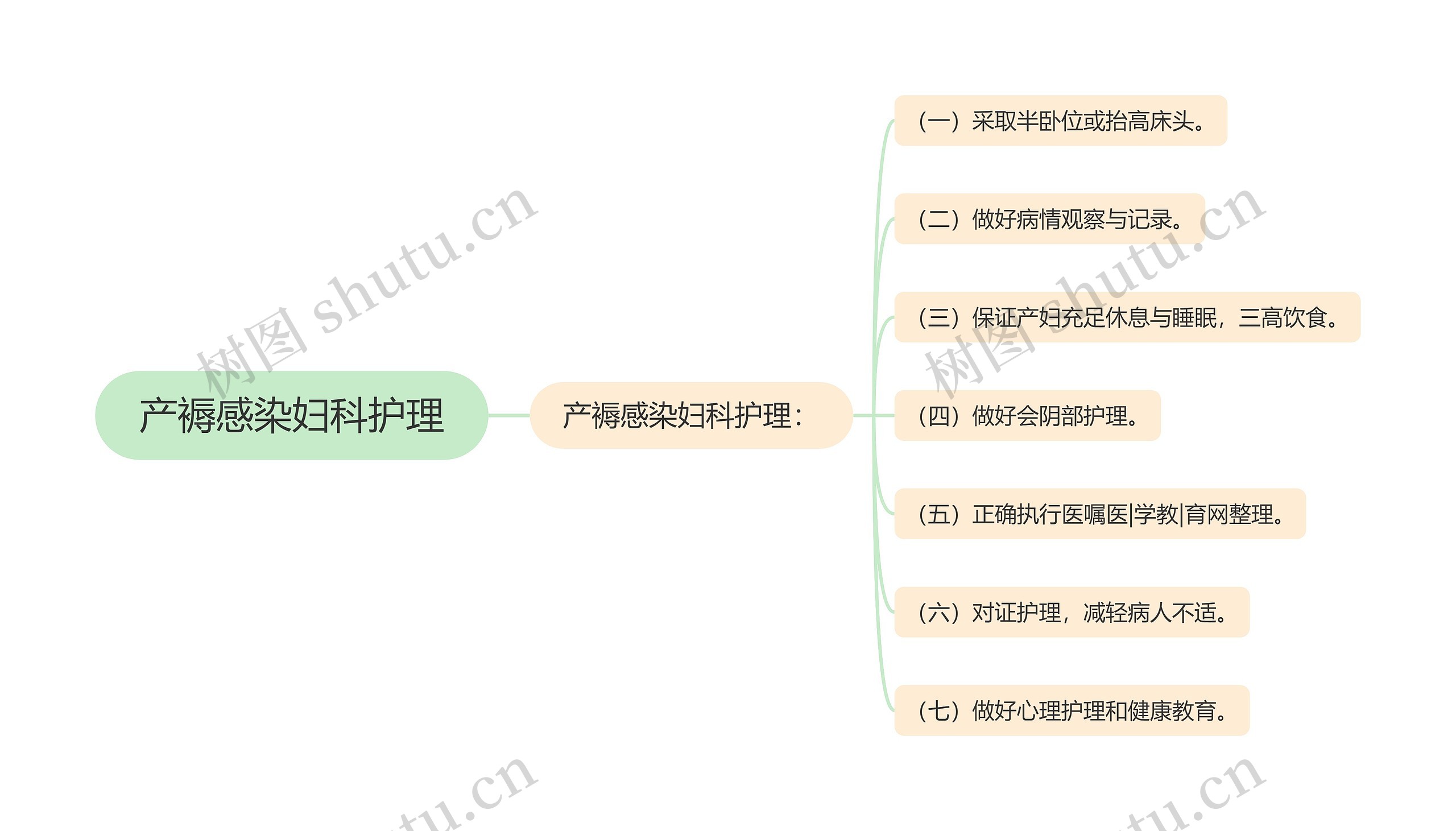 产褥感染妇科护理: (一)采取半卧位或抬高床头。 (二)做好病情观察与记录。 (三)保证产妇充足休息与睡眠,三高饮食。 (四)做好会阴部护理。 (五)正确执行医嘱医|学教|育网整理。 (六)对证护理,减轻病人不适。 (七)做好心理护理和健康教育。