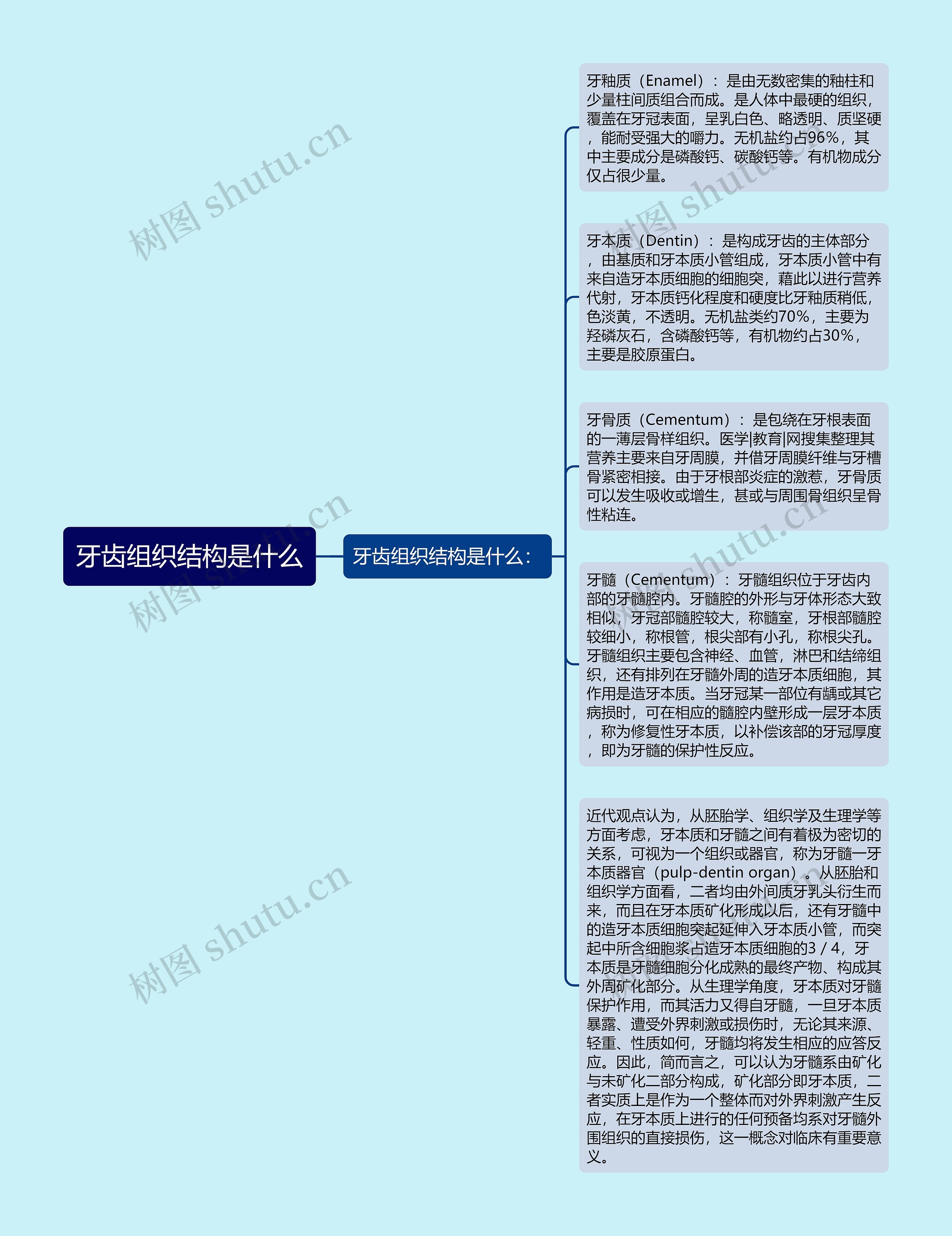 牙本质(Dentin):是构成牙齿的主体部分,由基质和牙本质小管组成,牙本质小管中有来自造牙本质细胞的细胞突,藉此以进行营养代射,牙本质钙化程度和硬度比牙釉质稍低,色淡黄,不透明。无机盐类约70%,主要为羟磷灰石,含磷酸钙等,有机物约占30%,主要是胶原蛋白。