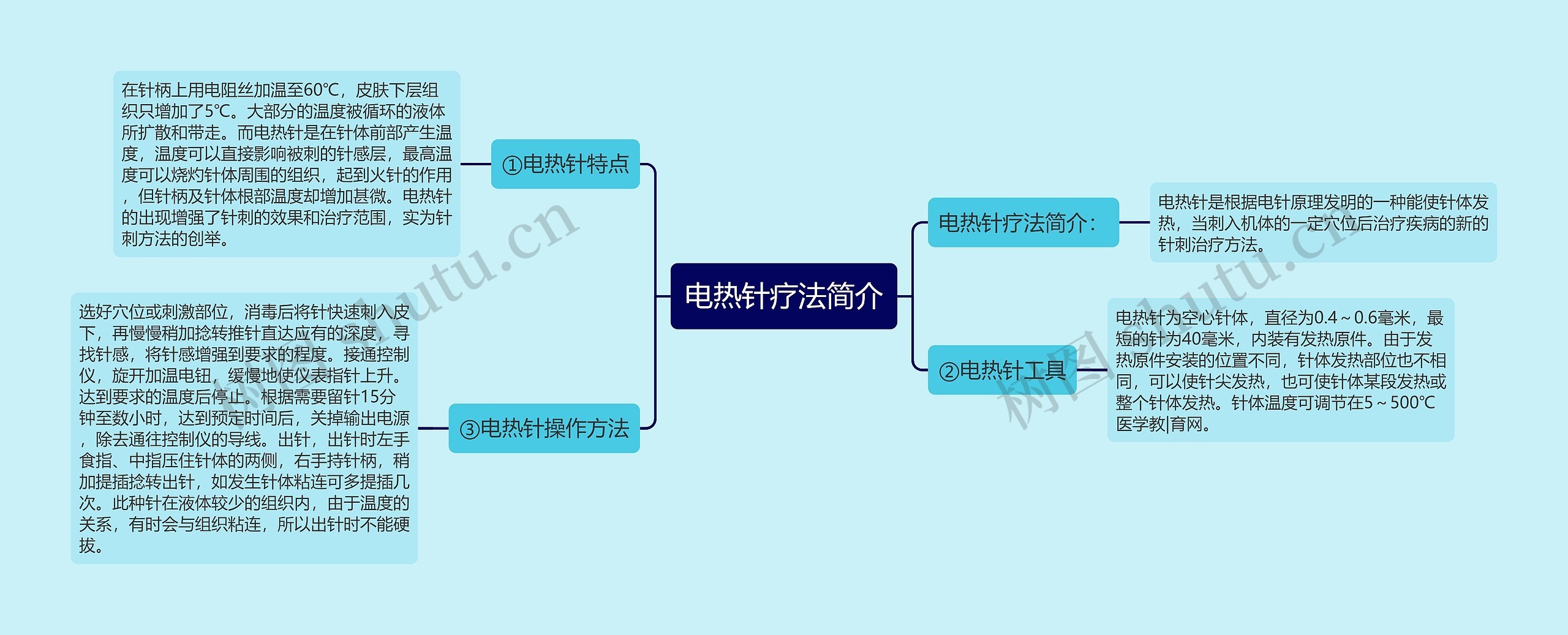 树图思维导图提供《电热针疗法简介》在线思维导图免费制作,点击“编辑”按钮,可对《电热针疗法简介》进行在线思维导图编辑,本思维导图属于思维导图模板主题,文件编号是:59687ebf453f31df0ea339b6c8746a31