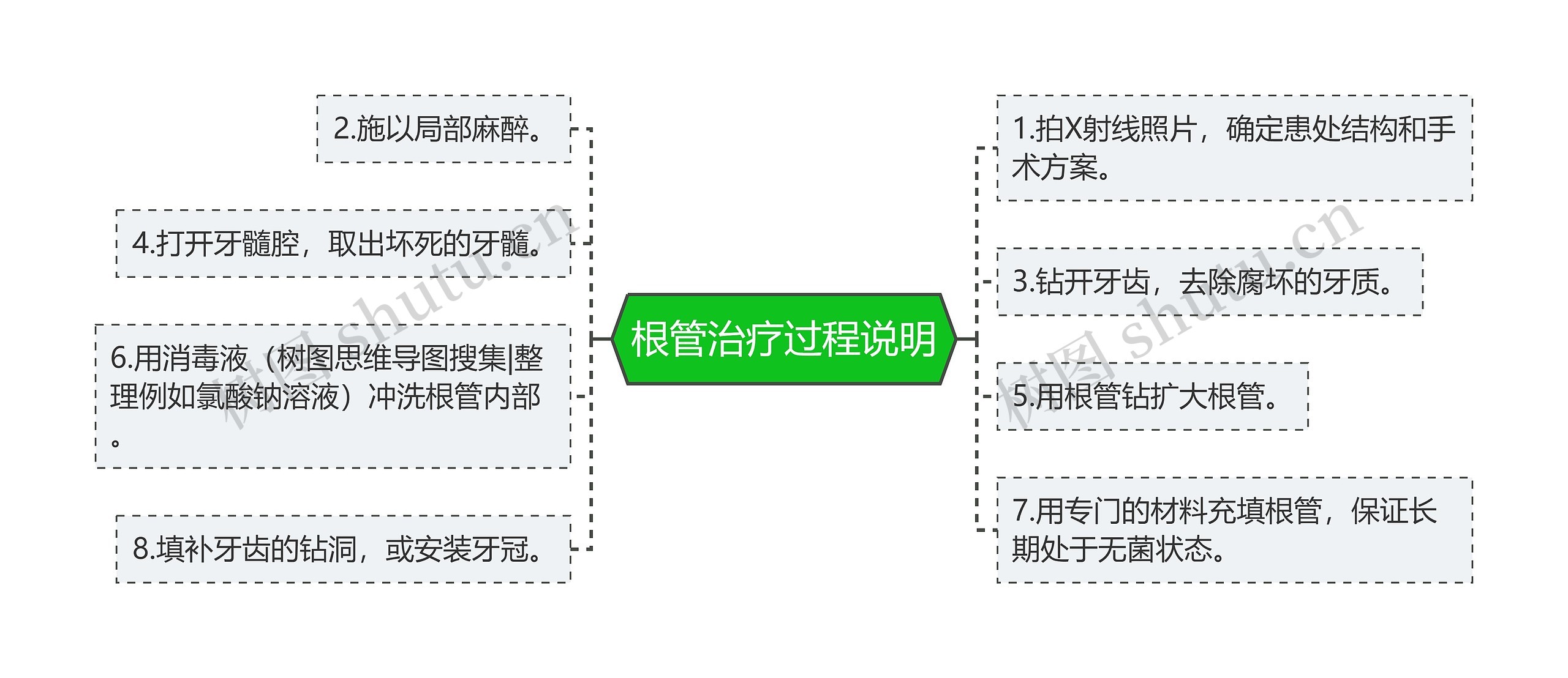 关于根管治疗的过程,树图思维导图整理如下: 1.拍X射线照片,确定患处结构和手术方案。 2.施以局部麻醉。 3.钻开牙齿,去除腐坏的牙质。 4.打开牙髓腔,取出坏死的牙髓。 5.用根管钻扩大根管。 6.用消毒液(树图思维导图搜集|整理例如氯酸钠溶液)冲洗根管内部。 7.用专门的材料充填根管,保证长期处于无菌状态。
