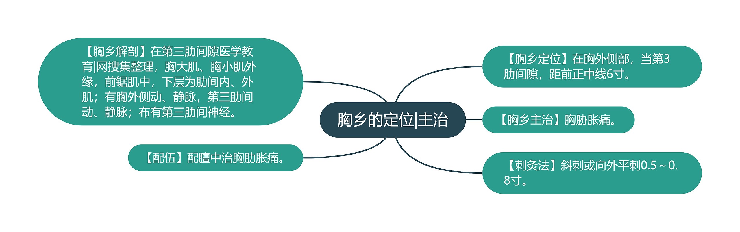 【胸乡定位】在胸外侧部,当第3肋间隙,距前正中线6寸。 【胸乡解剖】在第三肋间隙医学教育|网搜集整理,胸大肌、胸小肌外缘,前锯肌中,下层为肋间内、外肌;有胸外侧动、静脉,第三肋间动、静脉;布有第三肋间神经。 【胸乡主治】胸胁胀痛。 【配伍】配膻中治胸肋胀痛。 【刺灸法】斜刺或向外平刺0.5~0.8寸。