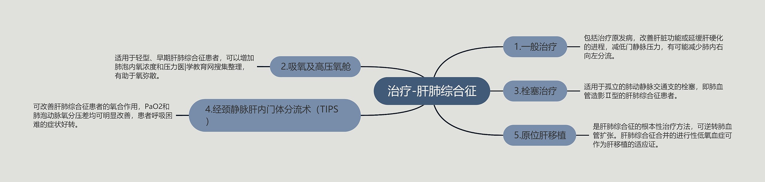 1.一般治疗 包括治疗原发病,改善肝脏功能或延缓肝硬化的进程,减低门静脉压力,有可能减少肺内右向左分流。 2.吸氧及高压氧舱 适用于轻型、早期肝肺综合征患者,可以增加肺泡内氧浓度和压力医|学教育网搜集整理,有助于氧弥散。 3.栓塞治疗 适用于孤立的肺动静脉交通支的栓塞,即肺血管造影Ⅱ型的肝肺综合征患者。