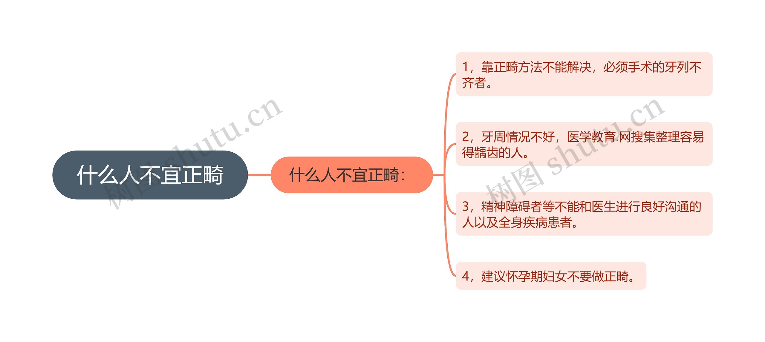树图思维导图提供《什么人不宜正畸》在线思维导图免费制作,点击“编辑”按钮,可对《什么人不宜正畸》进行在线思维导图编辑,本思维导图属于思维导图模板主题,文件编号是:a61a434dd09a1f2a6eb57b25b9eb44e2