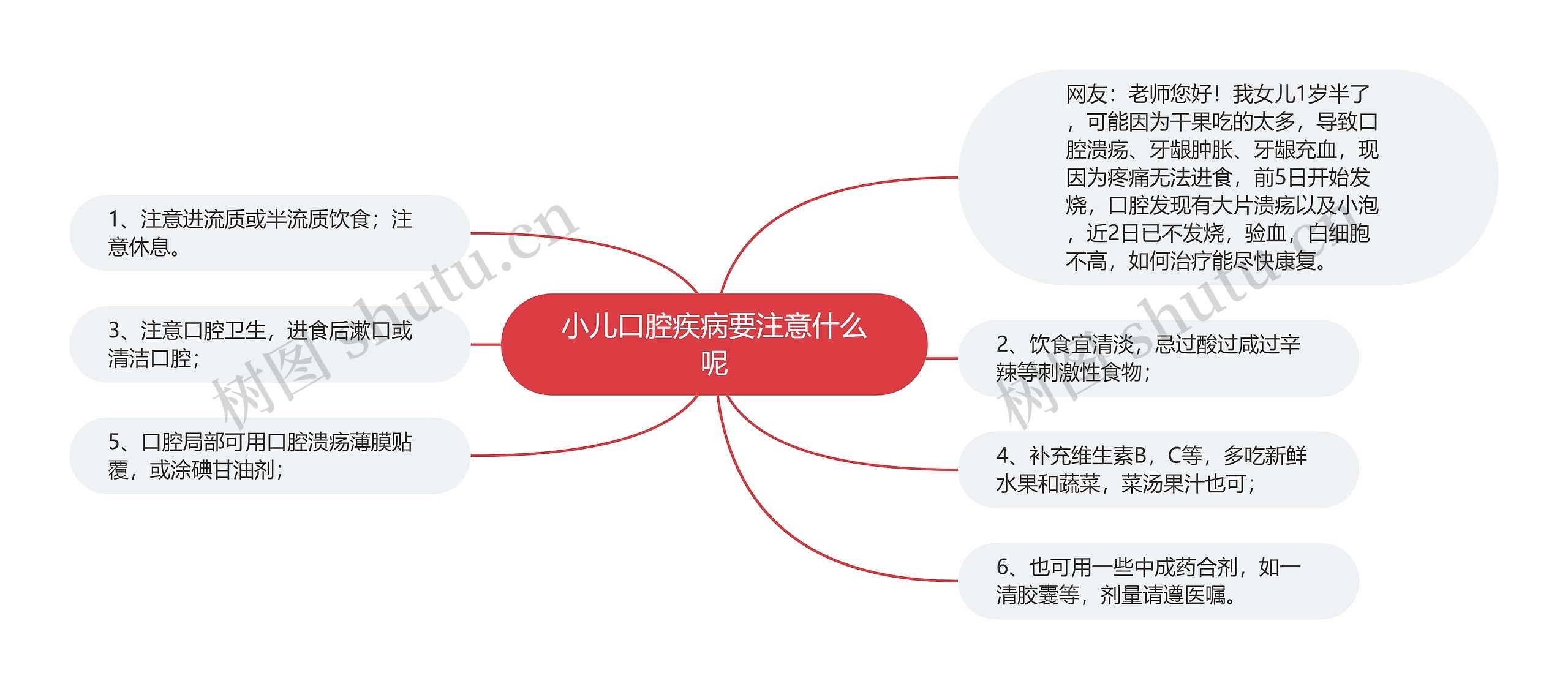 小儿口腔疾病要注意什么呢,树图思维导图搜集整理如下,希望能帮助广大网友了解小儿口腔疾病需要注意的有关事项: 网友:老师您好!我女儿1岁半了,可能因为干果吃的太多,导致口腔溃疡、牙龈肿胀、牙龈充血,现因为疼痛无法进食,前5日开始发烧,口腔发现有大片溃疡以及小泡,近2日已不发烧,验血,白细胞不高,如何治疗能尽