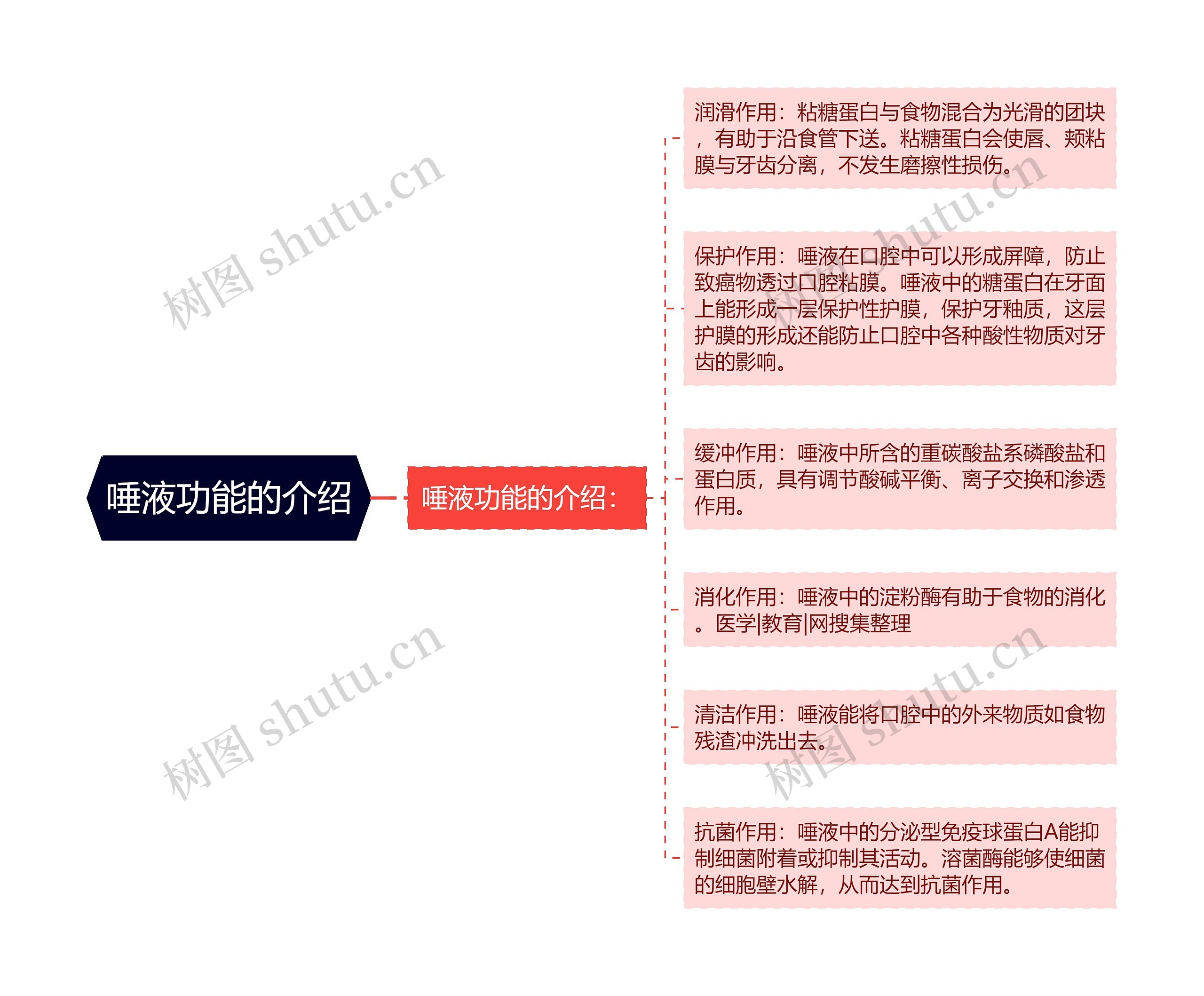 树图思维导图提供《唾液功能的介绍》在线思维导图免费制作,点击“编辑”按钮,可对《唾液功能的介绍》进行在线思维导图编辑,本思维导图属于思维导图模板主题,文件编号是:391de1968c5c46cc6e8a6afa45644af3