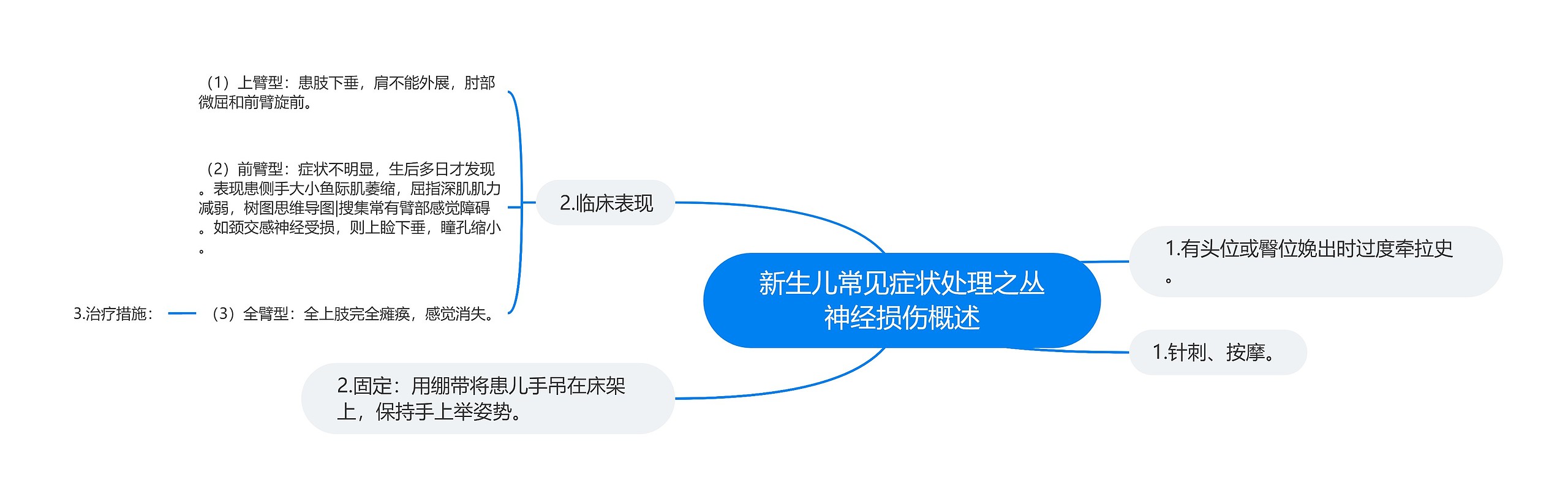 1.有头位或臀位娩出时过度牵拉史。 2.临床表现 (1)上臂型:患肢下垂,肩不能外展,肘部微屈和前臂旋前。 (2)前臂型:症状不明显,生后多日才发现。表现患侧手大小鱼际肌萎缩,屈指深肌肌力减弱,树图思维导图|搜集常有臂部感觉障碍。如颈交感神经受损,则上睑下垂,瞳孔缩小。 (3)全臂型:全上肢完全瘫痪,感觉消失。