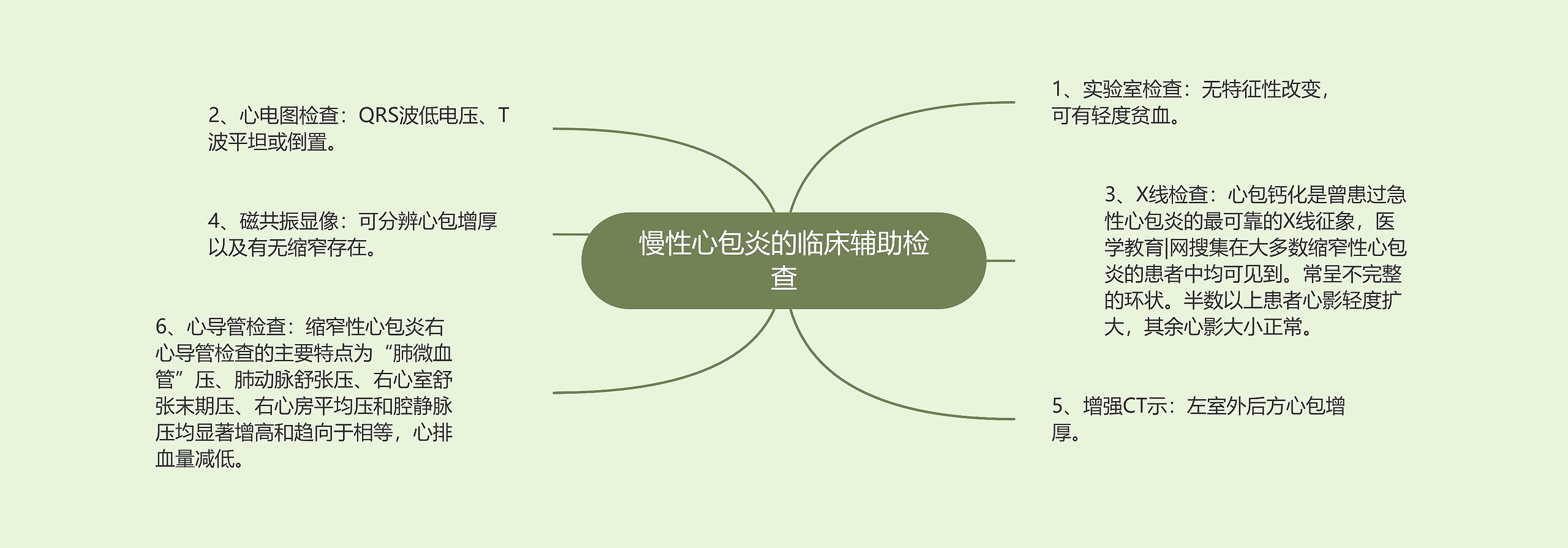 树图思维导图提供《慢性心包炎的临床辅助检查》在线思维导图免费制作,点击“编辑”按钮,可对《慢性心包炎的临床辅助检查》进行在线思维导图编辑,本思维导图属于思维导图模板主题,文件编号是:f9a9e16141ff66dd55d80561668b40fb