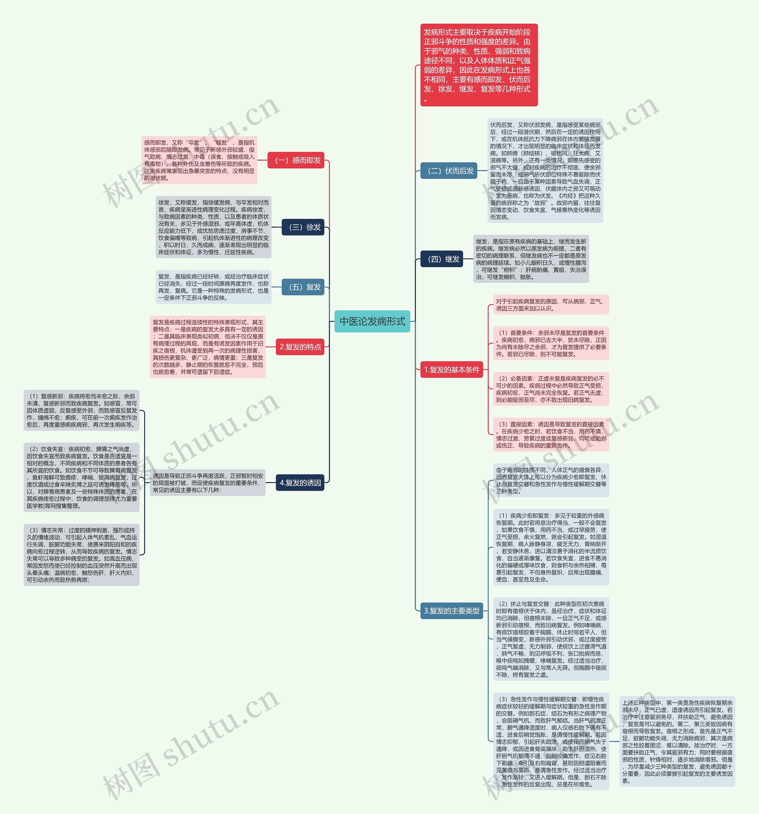 上述三种类型中,第一类是急性疾病恢复期余邪未尽,正气已虚,适逢诱因而引起复发。若治疗中注意驱邪务尽,并扶助正气,避免诱因,复发是可以避免的。第二、第三类皆因病有宿根而导致复发。宿根之形成,首先是正气不足,脏腑功能失调,无力消除病邪;其次是病邪之性胶着固涩,难以清除。故治疗时,一方面要扶助正气,令其驱邪有力;同时要根据宿邪的性质,针锋相对,逐步地消除宿邪。但是,为尽量减少三种类型的复发,避免诱因都十分重要,因此必须掌握引起复发的主要诱发因素。