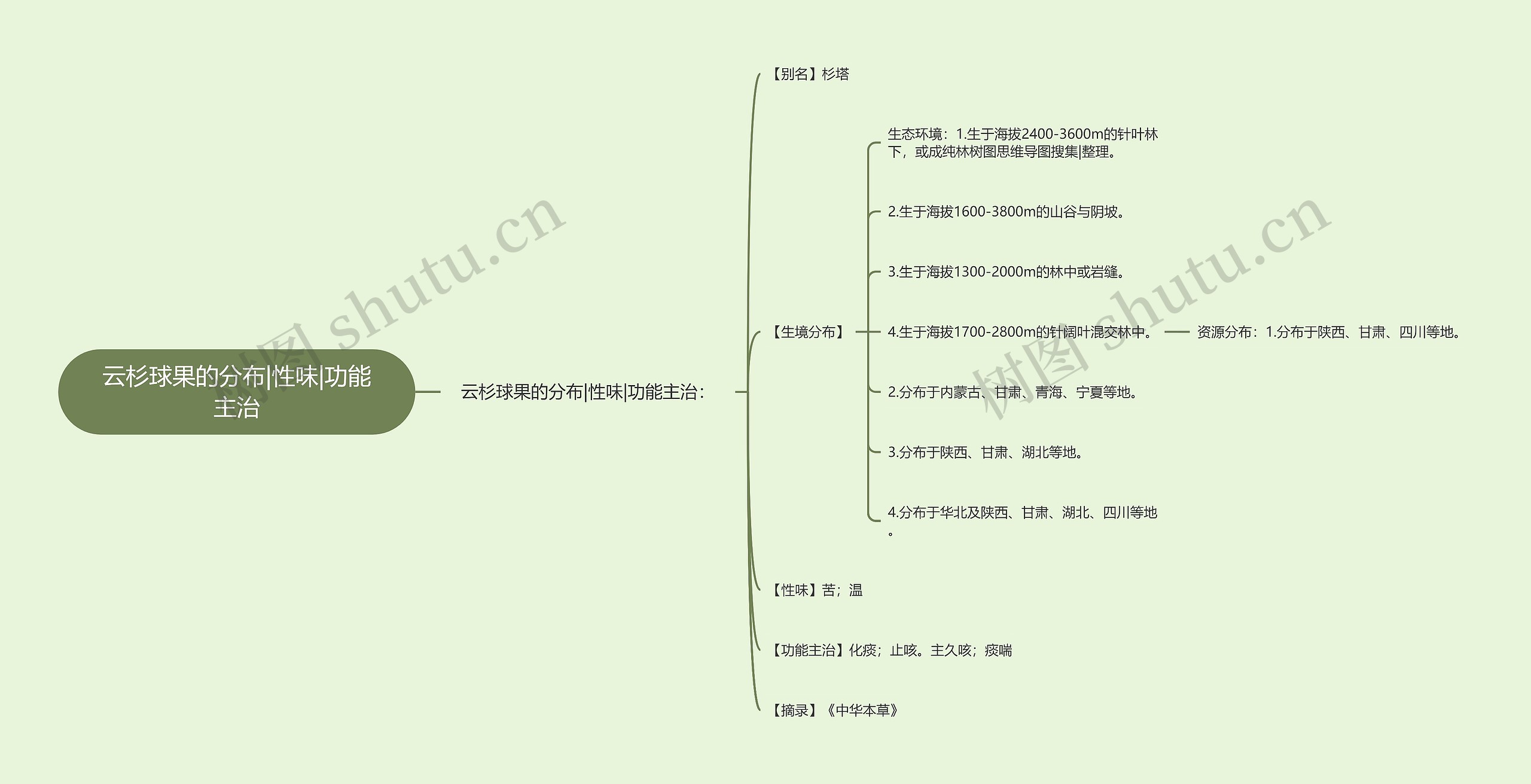 云杉球果的分布|性味|功能主治: 【别名】杉塔 【生境分布】 生态环境:1.生于海拔2400-3600m的针叶林下,或成纯林树图思维导图搜集|整理。 2.生于海拔1600-3800m的山谷与阴坡。 3.生于海拔1300-2000m的林中或岩缝。 4.生于海拔1700-2800m的针阔叶混交林中。 资源分布:1.分布于陕西、甘肃、四川等地。