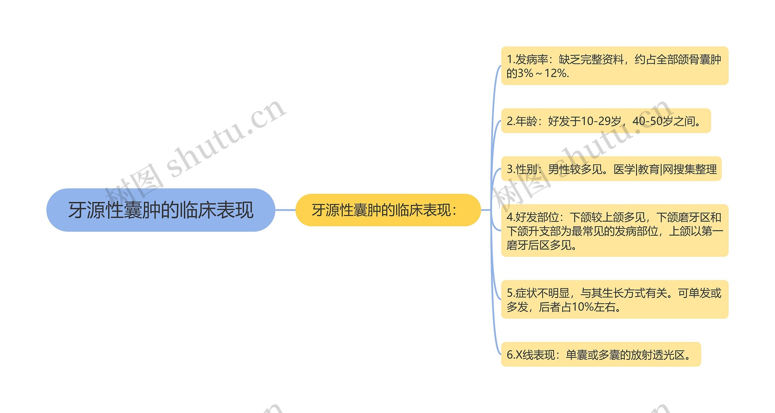 树图思维导图提供《牙源性囊肿的临床表现》在线思维导图免费制作,点击“编辑”按钮,可对《牙源性囊肿的临床表现》进行在线思维导图编辑,本思维导图属于思维导图模板主题,文件编号是:0727e6610865cb5f5cec095fd76ed49c