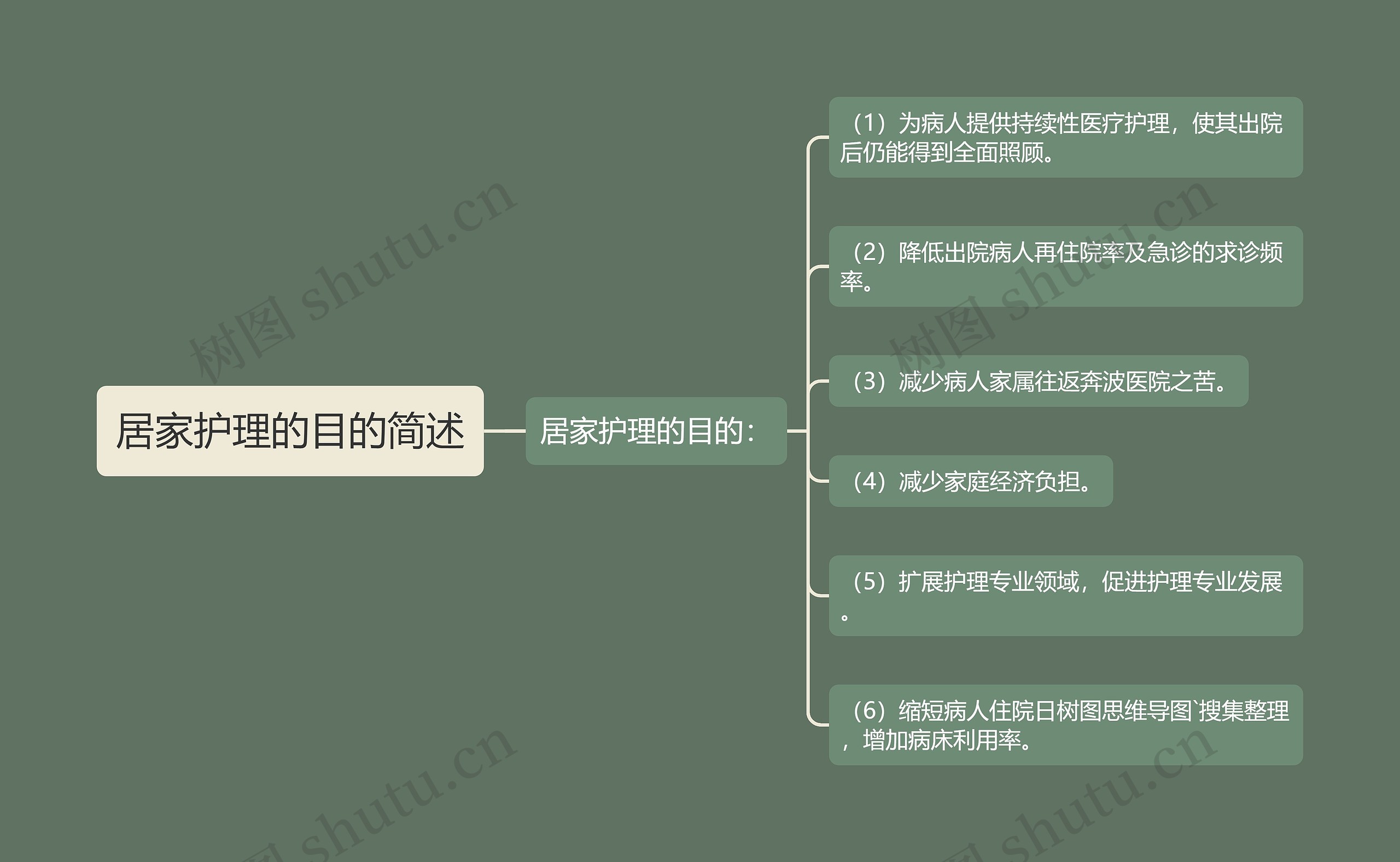 居家护理的目的: (1)为病人提供持续性医疗护理,使其出院后仍能得到全面照顾。 (2)降低出院病人再住院率及急诊的求诊频率。 (3)减少病人家属往返奔波医院之苦。 (4)减少家庭经济负担。 (5)扩展护理专业领域,促进护理专业发展。 (6)缩短病人住院日树图思维导图`搜集整理,增加病床利用率。