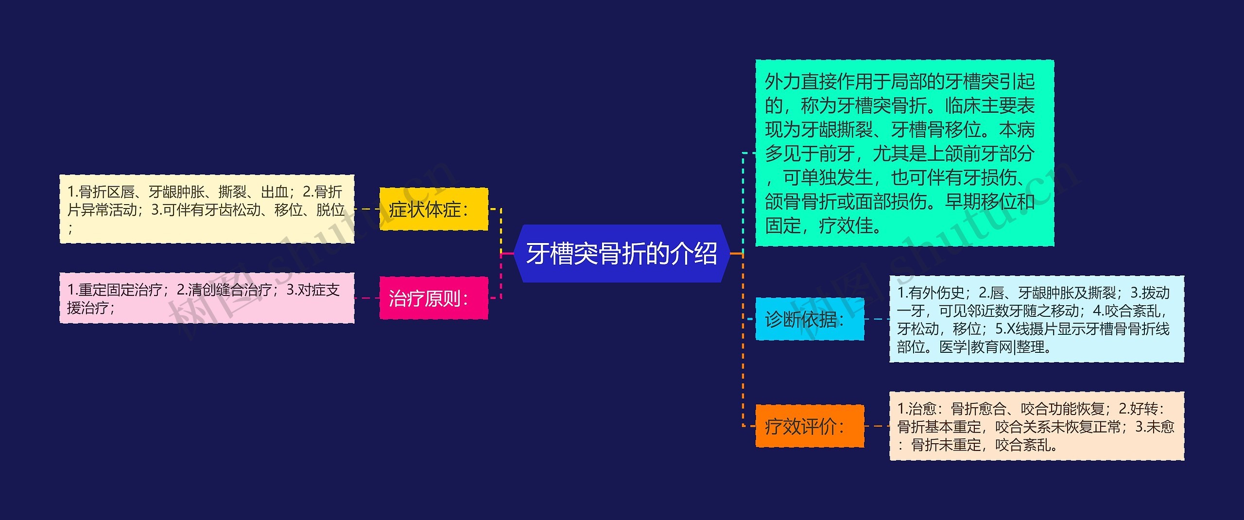 树图思维导图提供《牙槽突骨折的介绍》在线思维导图免费制作,点击“编辑”按钮,可对《牙槽突骨折的介绍》进行在线思维导图编辑,本思维导图属于思维导图模板主题,文件编号是:5210032628e408770080f1251a40b8ee