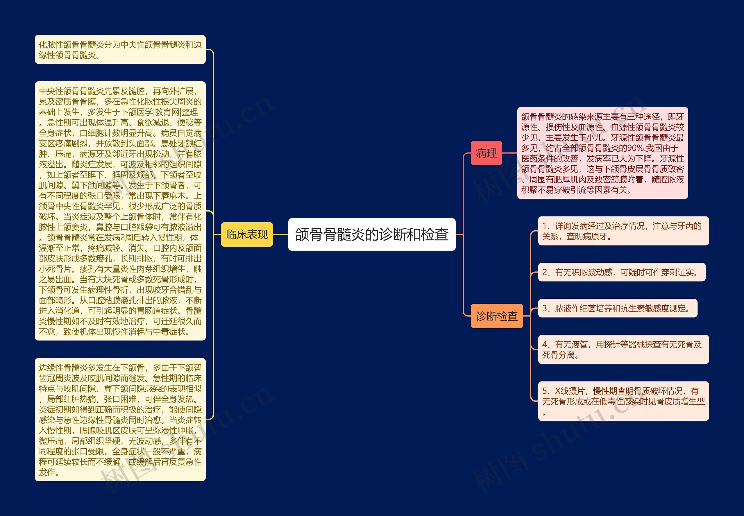 树图思维导图提供《颌骨骨髓炎的诊断和检查》在线思维导图免费制作,点击“编辑”按钮,可对《颌骨骨髓炎的诊断和检查》进行在线思维导图编辑,本思维导图属于思维导图模板主题,文件编号是:2b577bcd082e6fc7cabd41e5717168e0